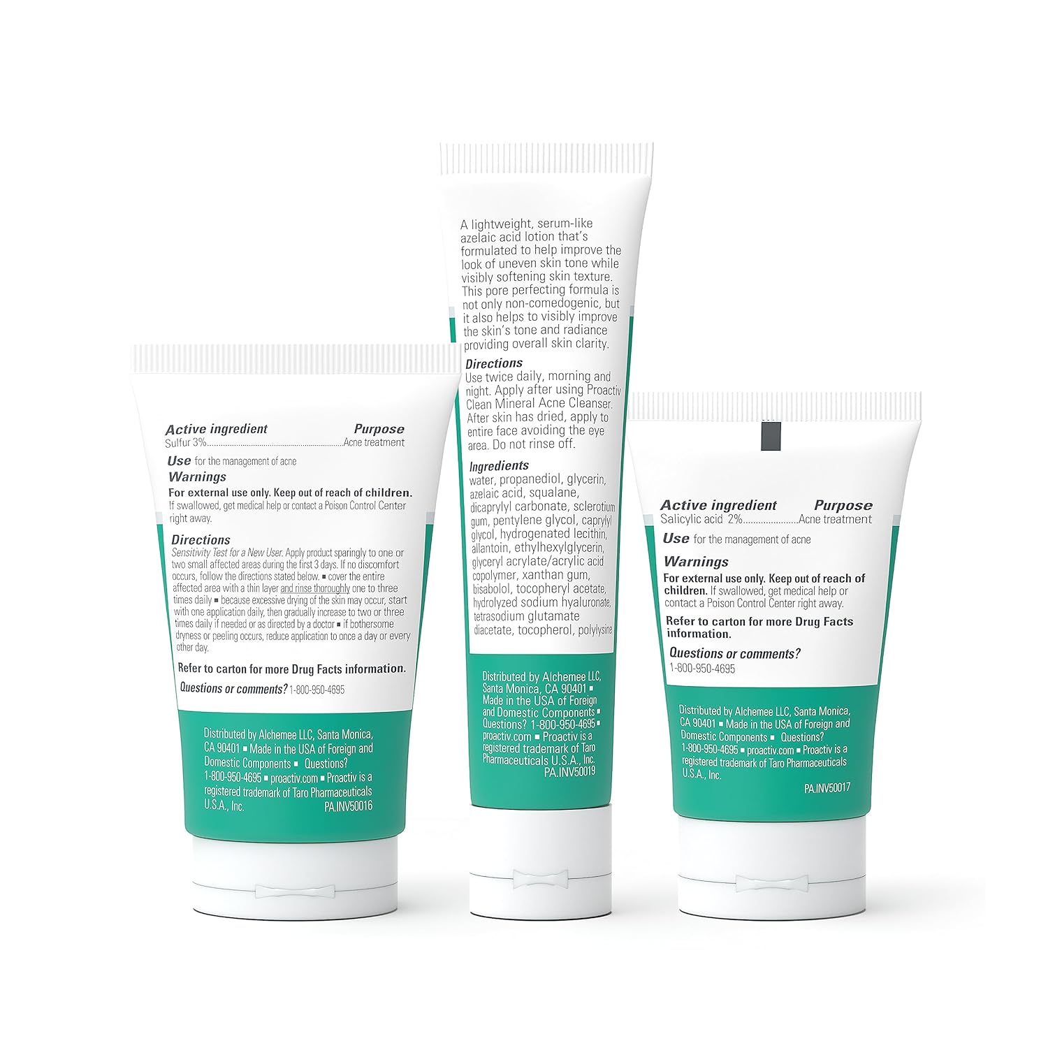 - The Proactiv Clean 3-Step Acne Treatment Routine includes: Mineral Acne Cleanser, 2 FL. OZ; Azelaic Pore Perfector, 1 FL. OZ; Acne Clearing Hydrator, 1 FL. OZ; Zits Happen Patches, 15 CT- For best results, use the Proactiv Clean 3-Step Routine consistently, morning and night.