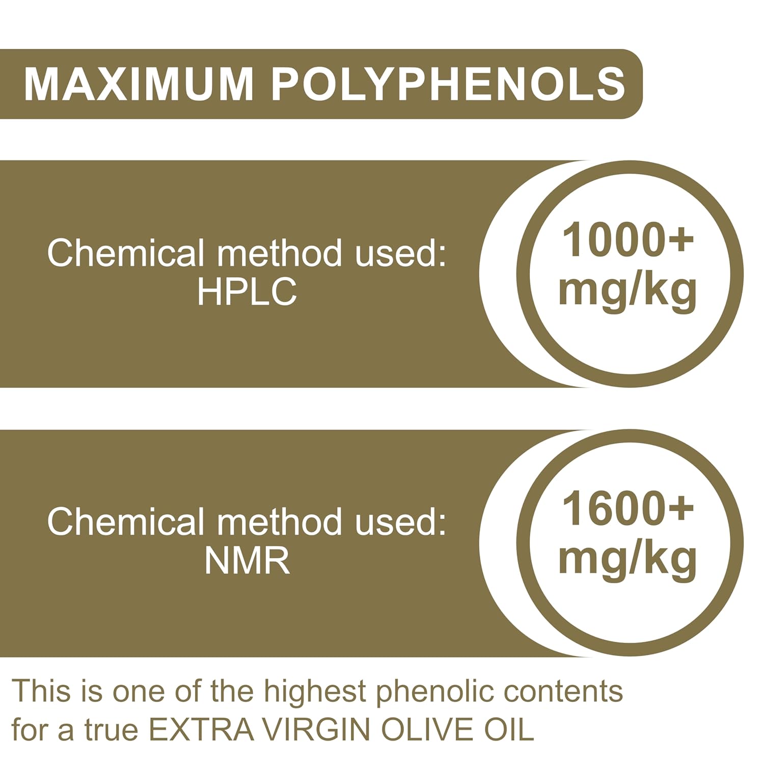 - PHENOLIC CONTENT: 1000+ mg/kg (HPLC) and 1600+ mg/kg (NMR). Probably the highest phenolic content for a TRUE Extra Virgin Olive Oil on the market today. Tested during production using both the HPLC and NMR chemical testing methods.