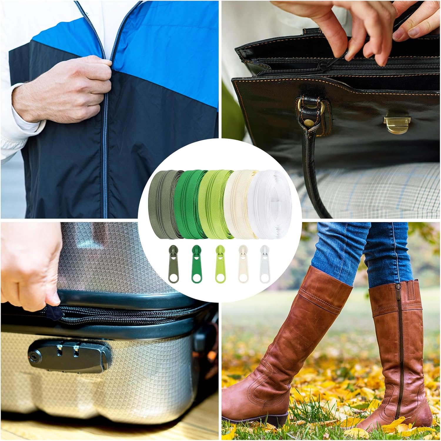 DOITEM 15.3 Yards/ 14 m 5 Pieces Assorted Colors #3 Nylon Coil Zippers, Sewing Zippers Endless Zips with 20 Pieces Zipper Sliders Zip Heads for DIY Sewing Tailor Craft Supplies (Green White)