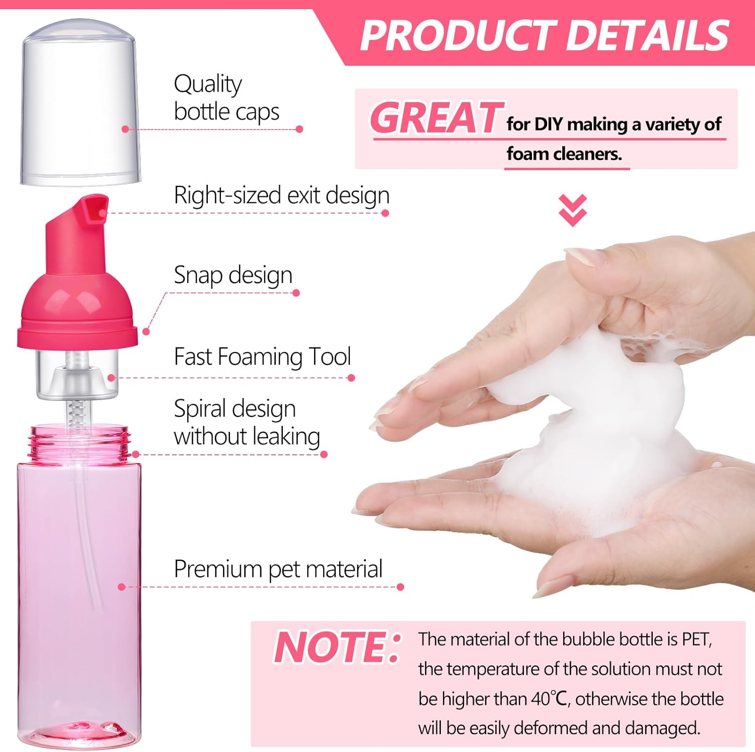 - 120 Pcs Mini Mousse Bottles: our foam pump bottle set includes 120 pieces of 60ml (2oz) plastic foam soap bottles, which are transparent pink bottles with pink pump heads; Each bottle has a clear cap on the top to prevent the contents from overflowing while carrying; The foaming dispenser bottles can be easily foamed, small, lightweight, and portable, the quantity is enough for your daily use and sharing