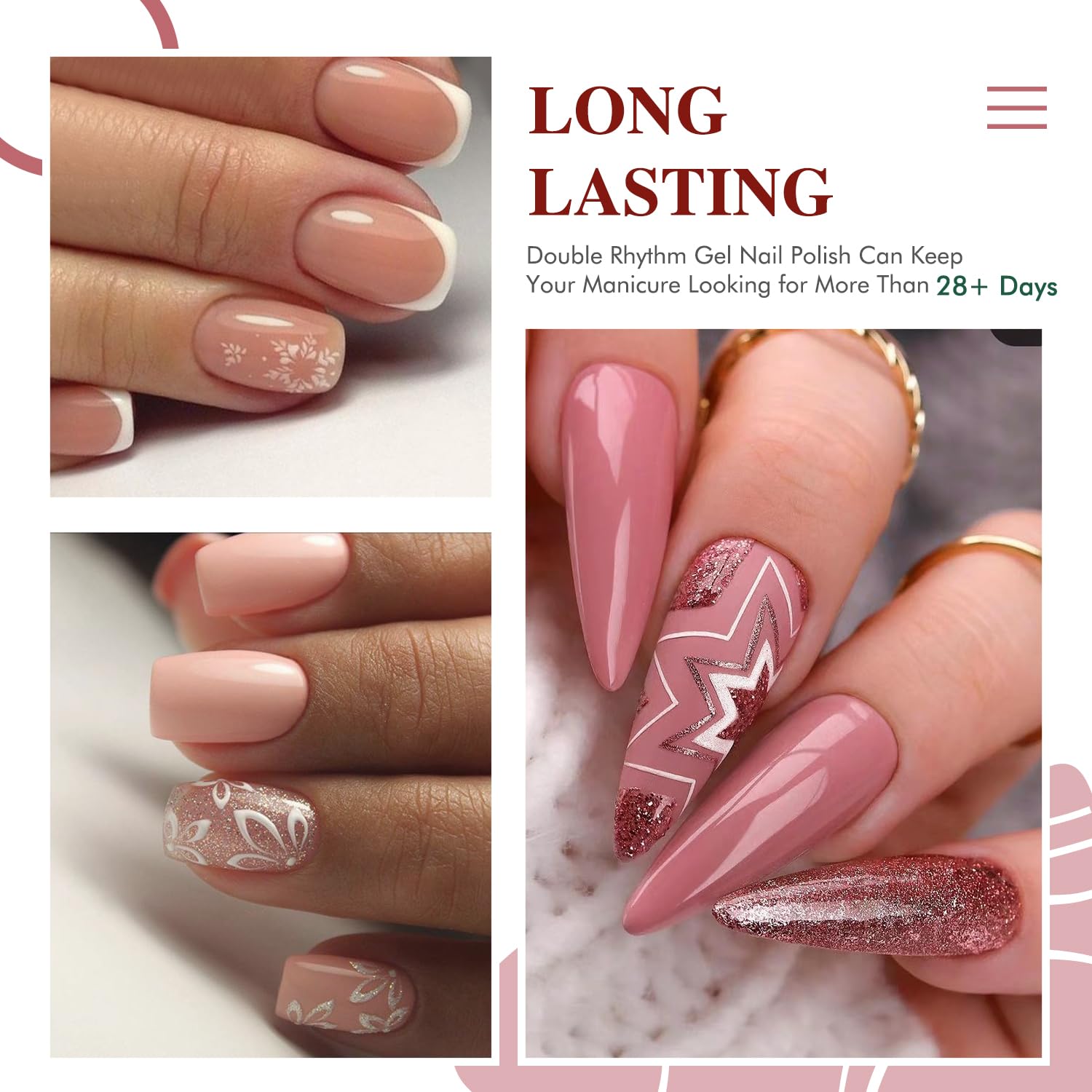 - Nude Pink Gel Polish Set: Double Rhythm pink gel polish kit includes 6colors 7.5ml / 0.26 fl.oz gel polish. This pink gel polish set includes light pink,milky pink ,baby pink ,pink glitter ,nude pink and neon pink 6 colors. They can be combined with each other arbitrarily, so you can creat your own nail art sthle.