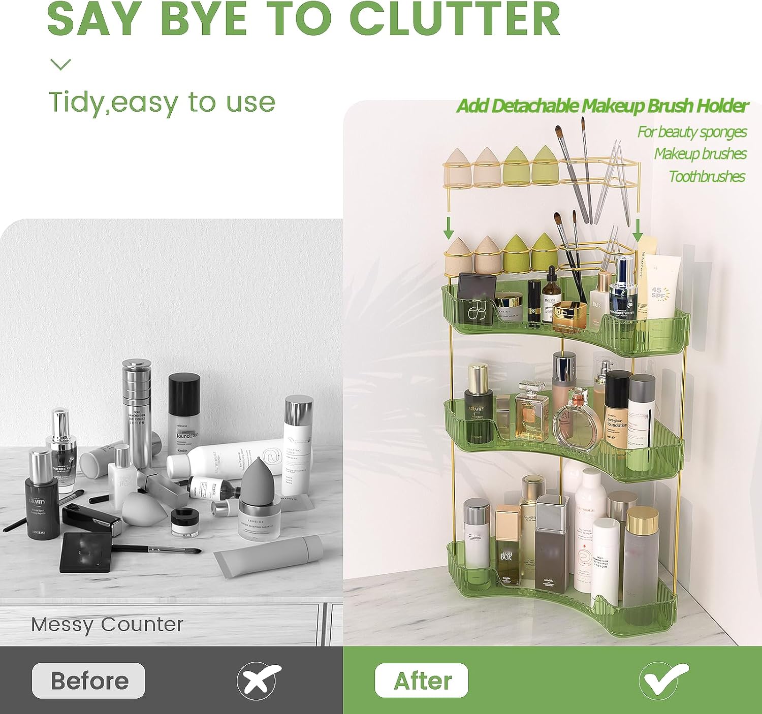 NATURE'S SOURCE Makeup Organizer for Vanity, 3-Tier Corner Bathroom Organizer Countertop with Makeup Brush Holder, Corner Counter Storage for Bathroom Dresser- Green