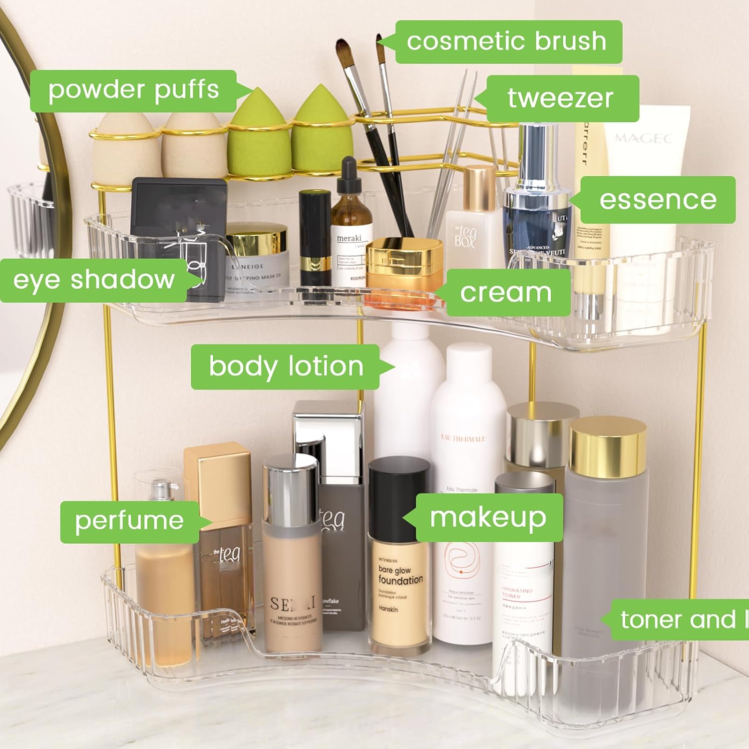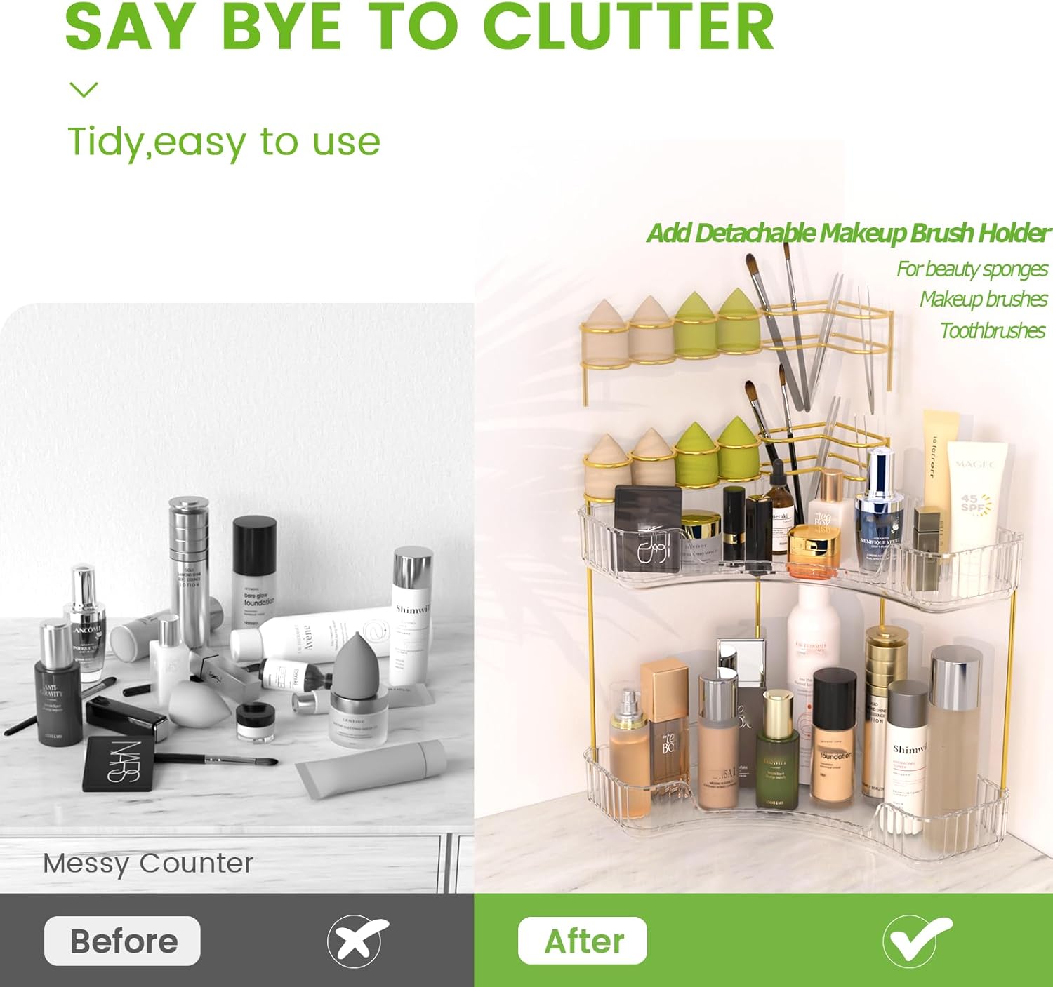 - ăCorner Makeup OrganizerăSay goodbye to your cluttered countertop, our countertop organizer fully utilizes corner space, adding 100% extra storage space and keeping a tidy and organized bathroom counter