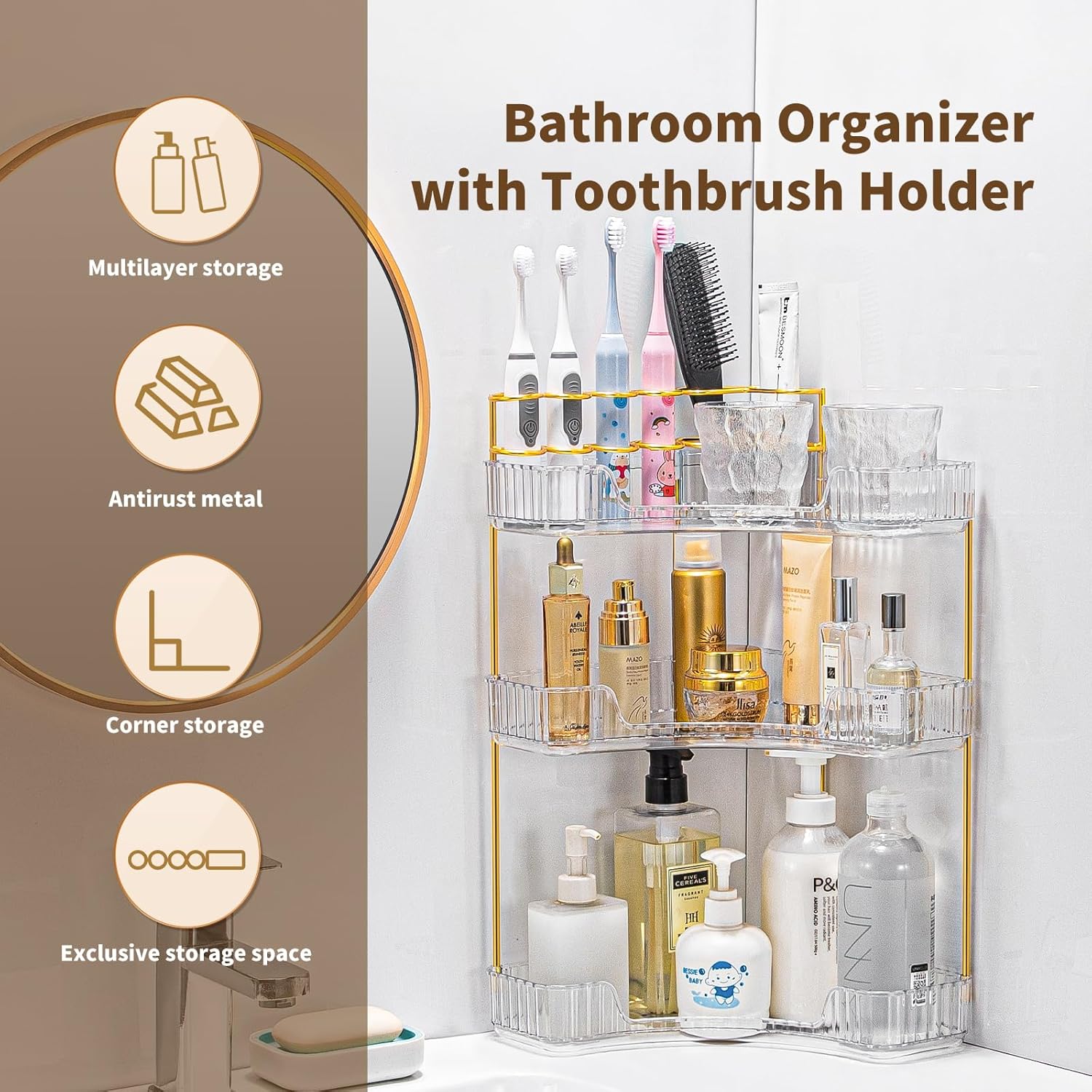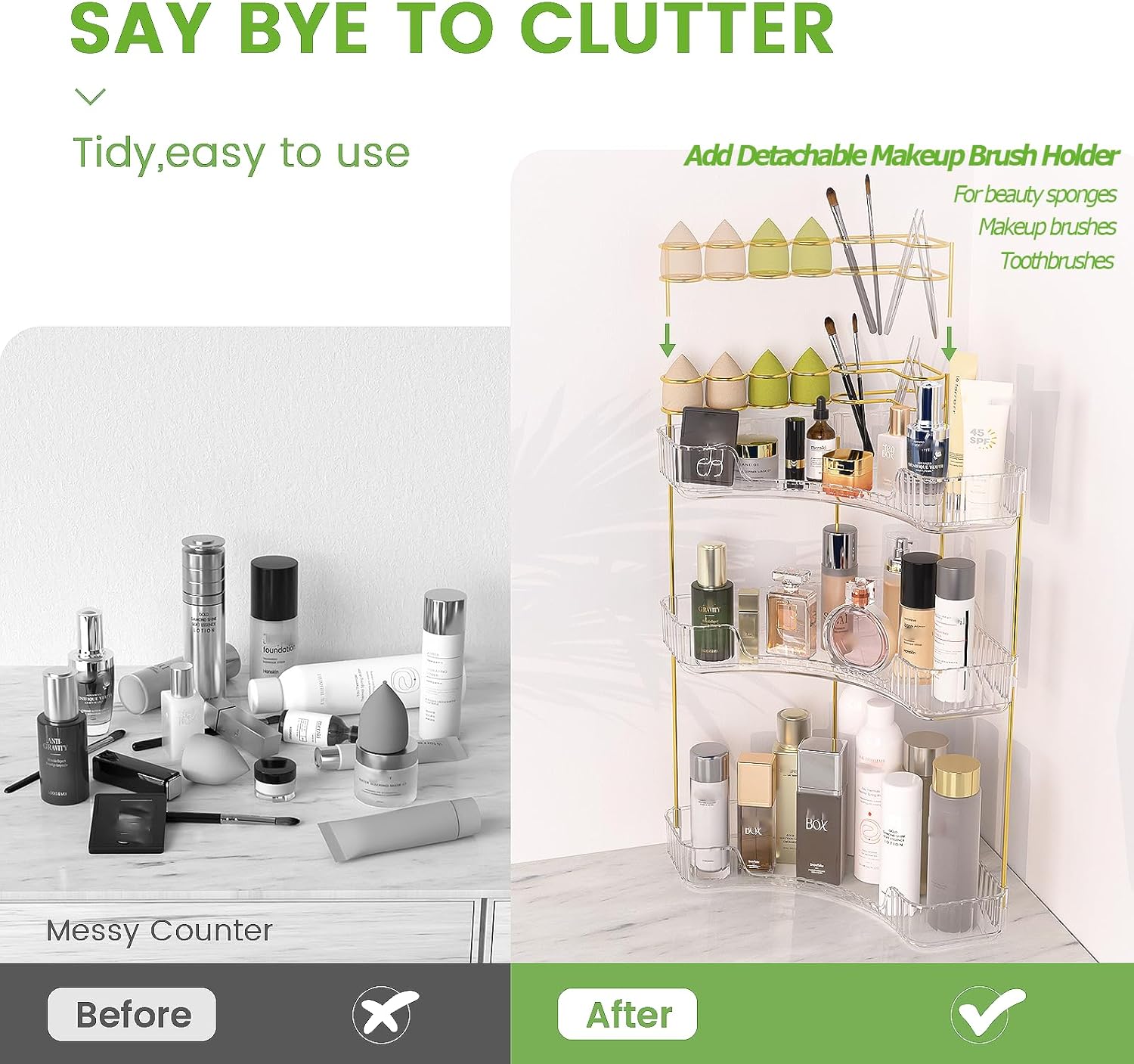 - 【Easily Assemble】3 tier corner bathroom organizer is 10*10*18 inch, large capacity perfect size and enough height for high toiletries as tall as shower gel, shampoo or skincares, makeup remover. A stylish and practical gifts for makeup enthusiasts, helping them keep their makeup collection well-organized