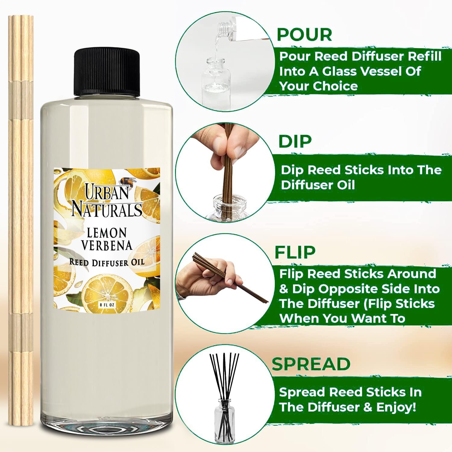 Urban Naturals Reed Diffuser Oil Refill Lemon Verbena with Lemon Zest, Bergamot, Vetiver, Cedarwood 8 oz + Free Reed Sticks, Made in The USA