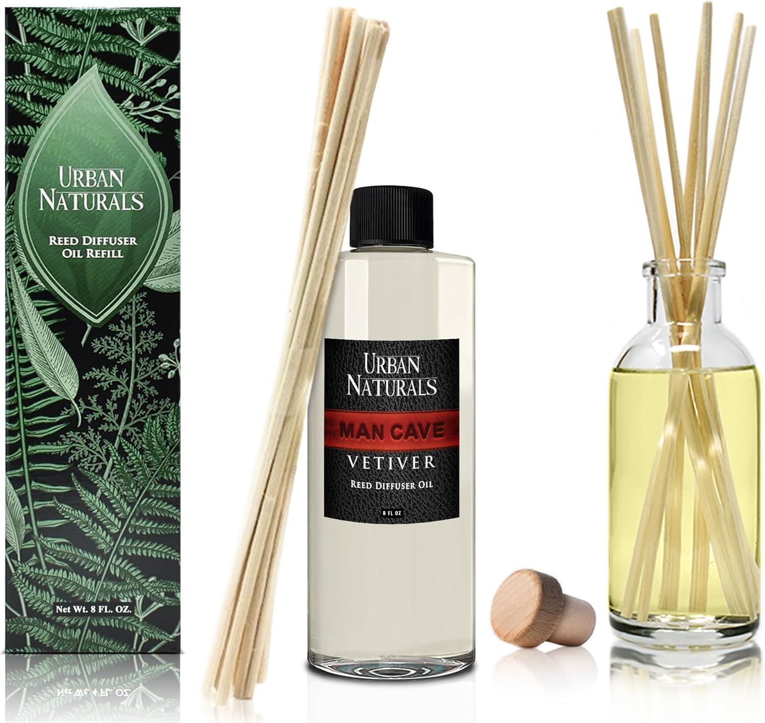 Urban Naturals Reed Diffuser Oil Refill Man Cave Vetiver with Oud, Amber, Frankincense 8 oz + Free Reed Sticks, Made in The USA