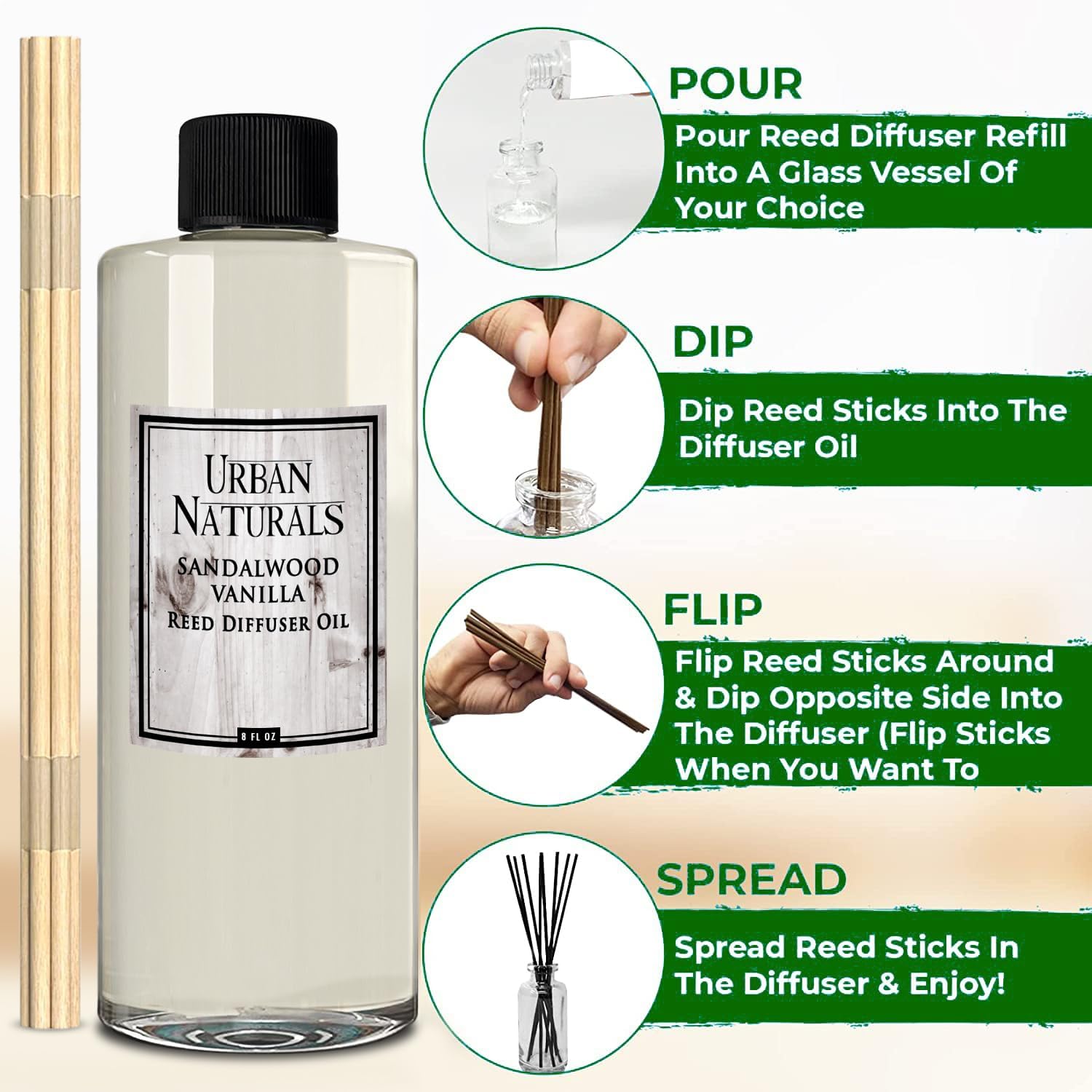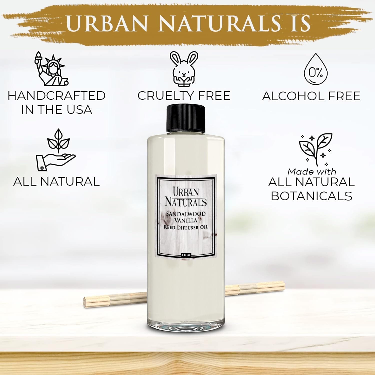 Urban Naturals Reed Diffuser Oil Refill Sandalwood Vanilla with Tahitian Vanilla, Bourbon Notes 8 oz + Free Reed Sticks, Made in The USA