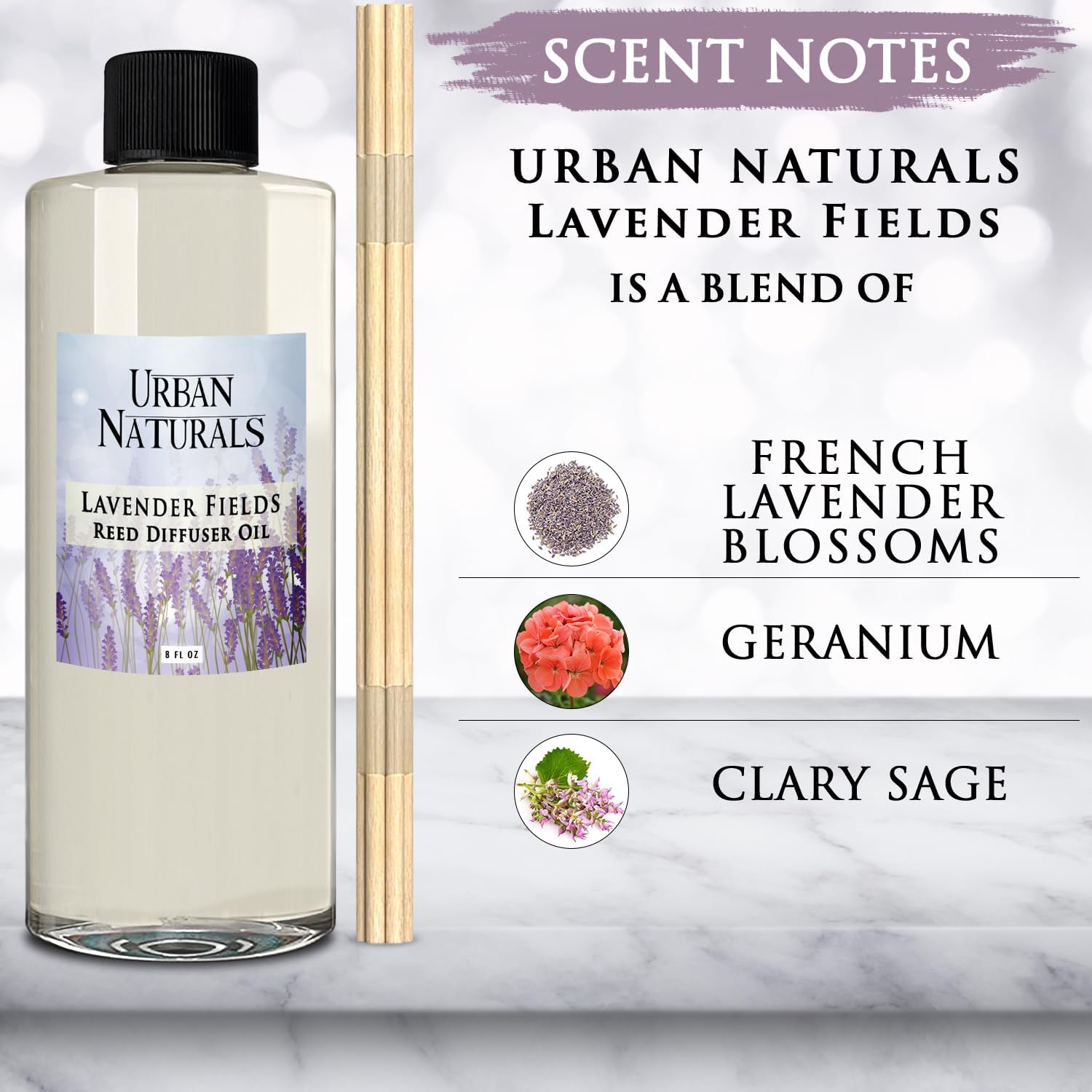 - 【LAVENDER FIELDS SCENT】Includes one 8 oz reed diffuser refill oil and a free set of natural replacement reed sticks. Classic lavender enhanced by soft floral notes of geranium and clary sage—perfect for unwinding and stress relief.