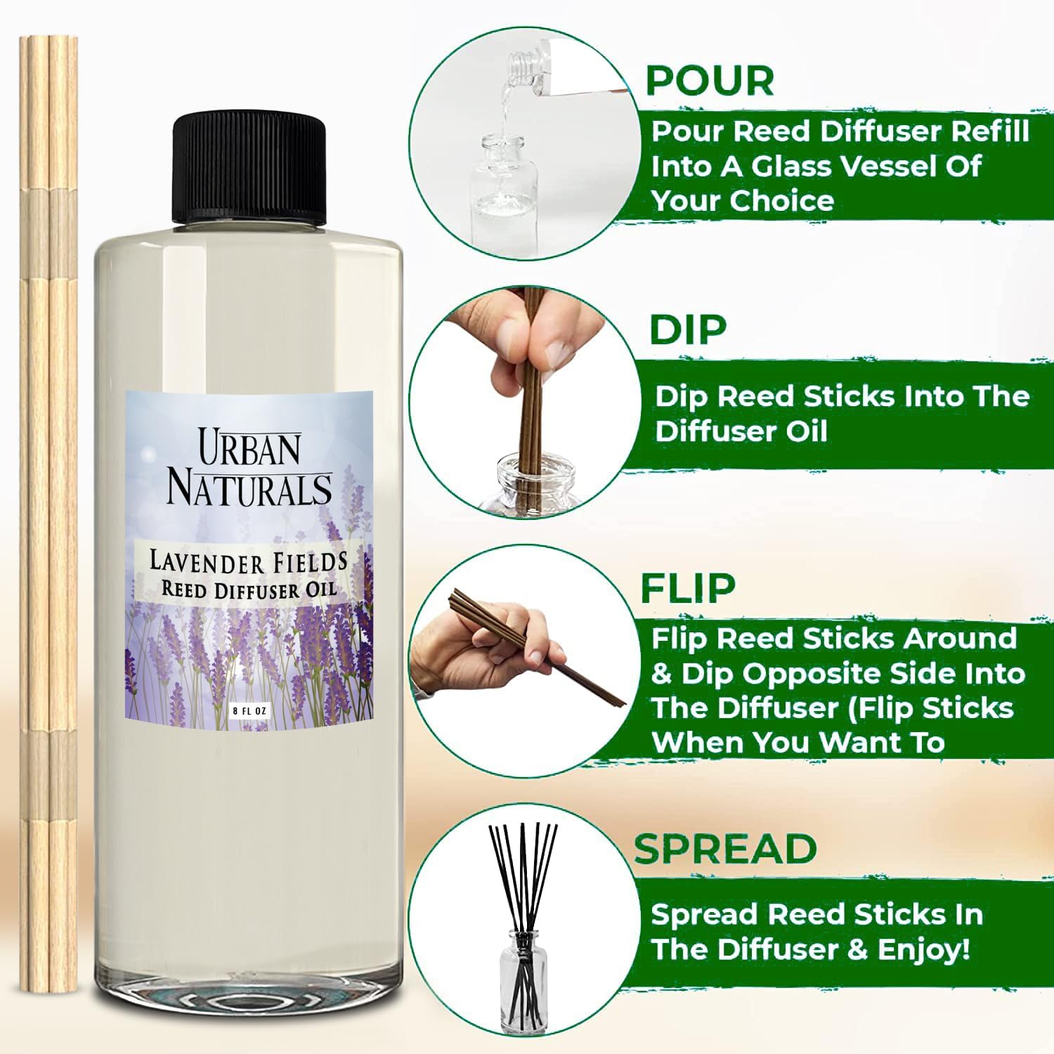 Urban Naturals Reed Diffuser Oil Refill Lavender Fields with Geranium, Clary Sage, Soft Florals 8 oz + Free Reed Sticks, Made in The USA