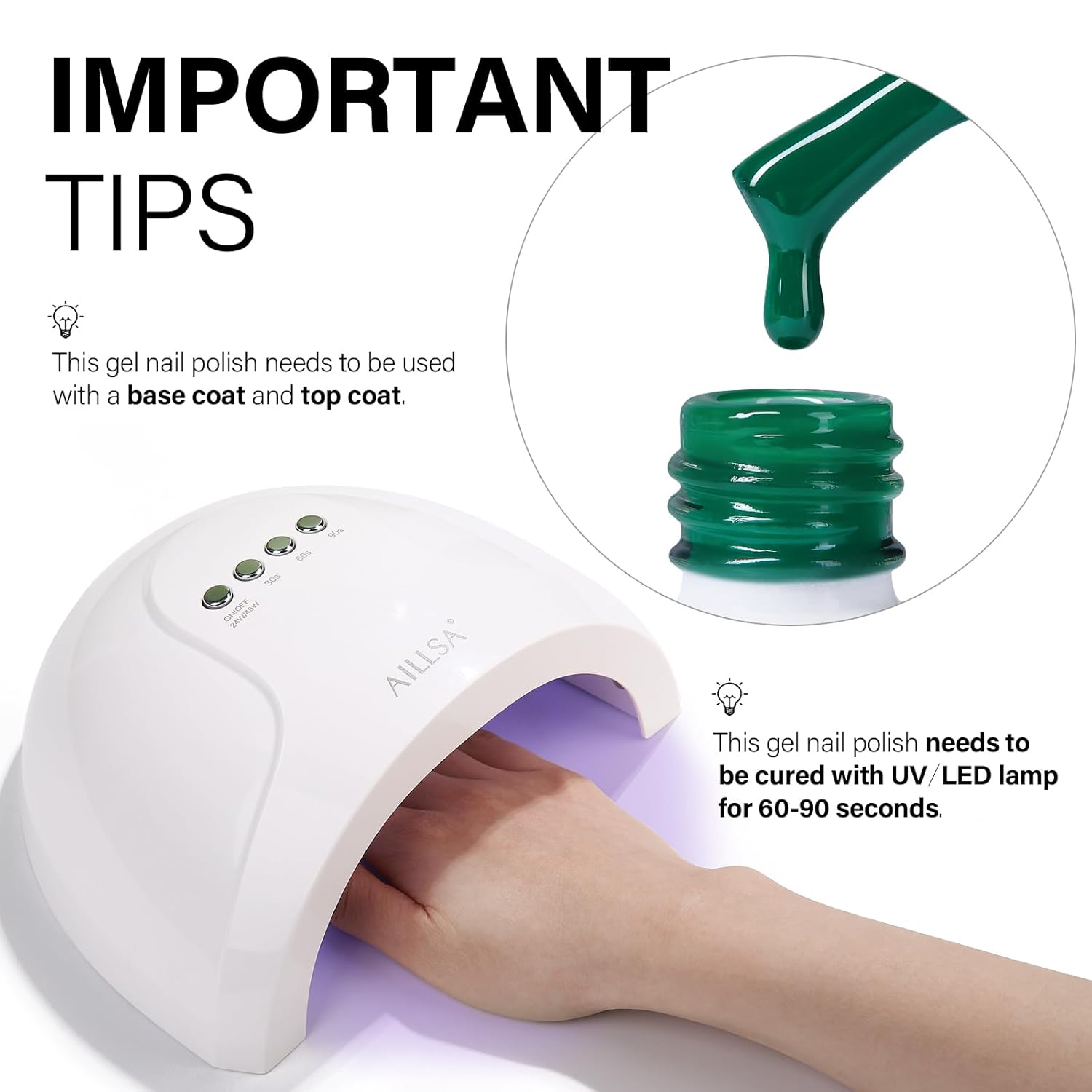 - 【 LONG-LASTING SHINE 】AILLSA pine green gel nail polish needs to be cured under L E D/U V light, under the correct use steps, it can last for 21-28 days and keep the shiny luster. You'll never have to worry about your nails peeling off while showering and doing housework. Let AILLSA serve you a longer time!