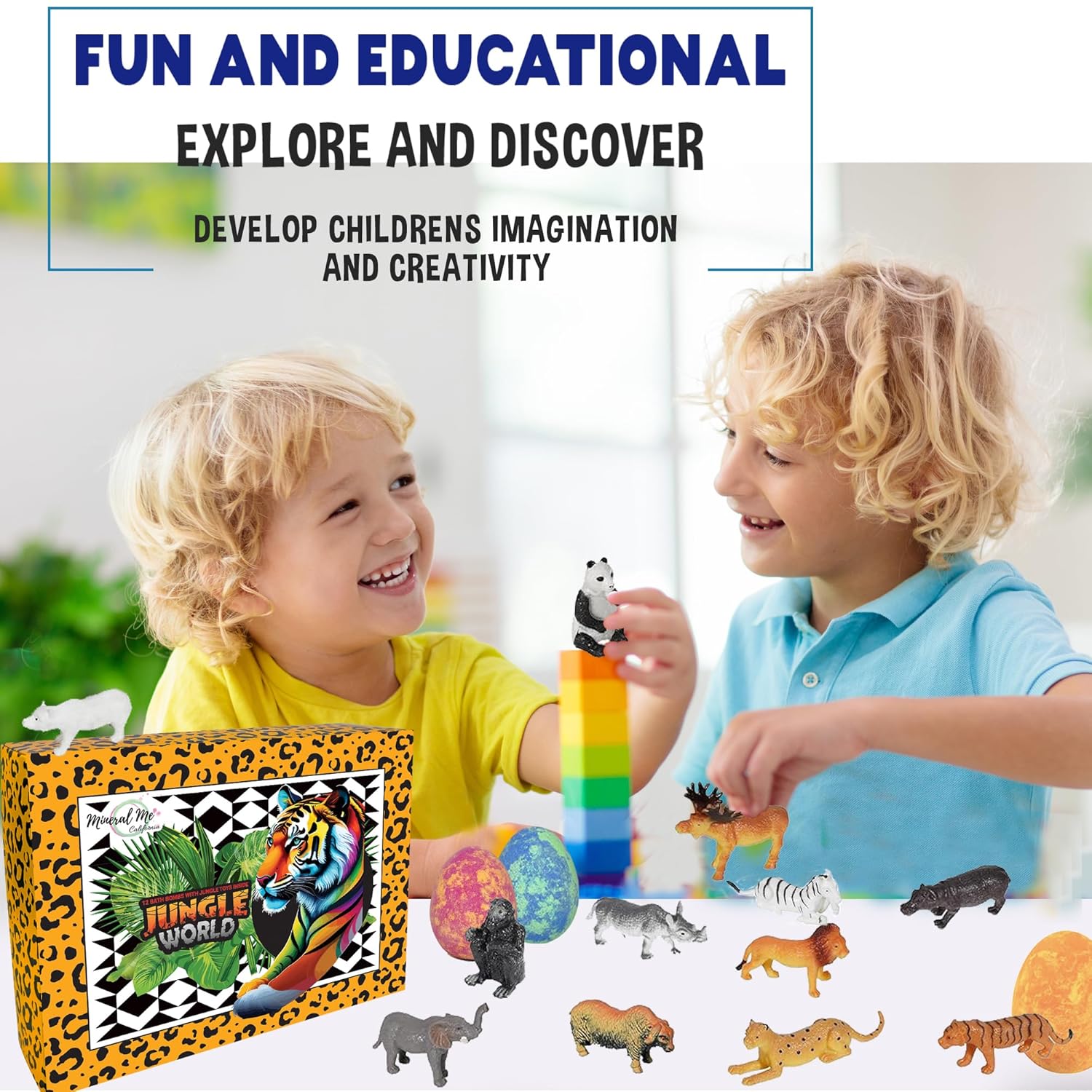 - 12 Bath Bombs for kids with surprise inside - All natural ingredients with no undesirable additives. Your kiddo will love the colorful scented water, bubbly foam, and a unique high quality surprize jungle toys in each egg bathbomb.