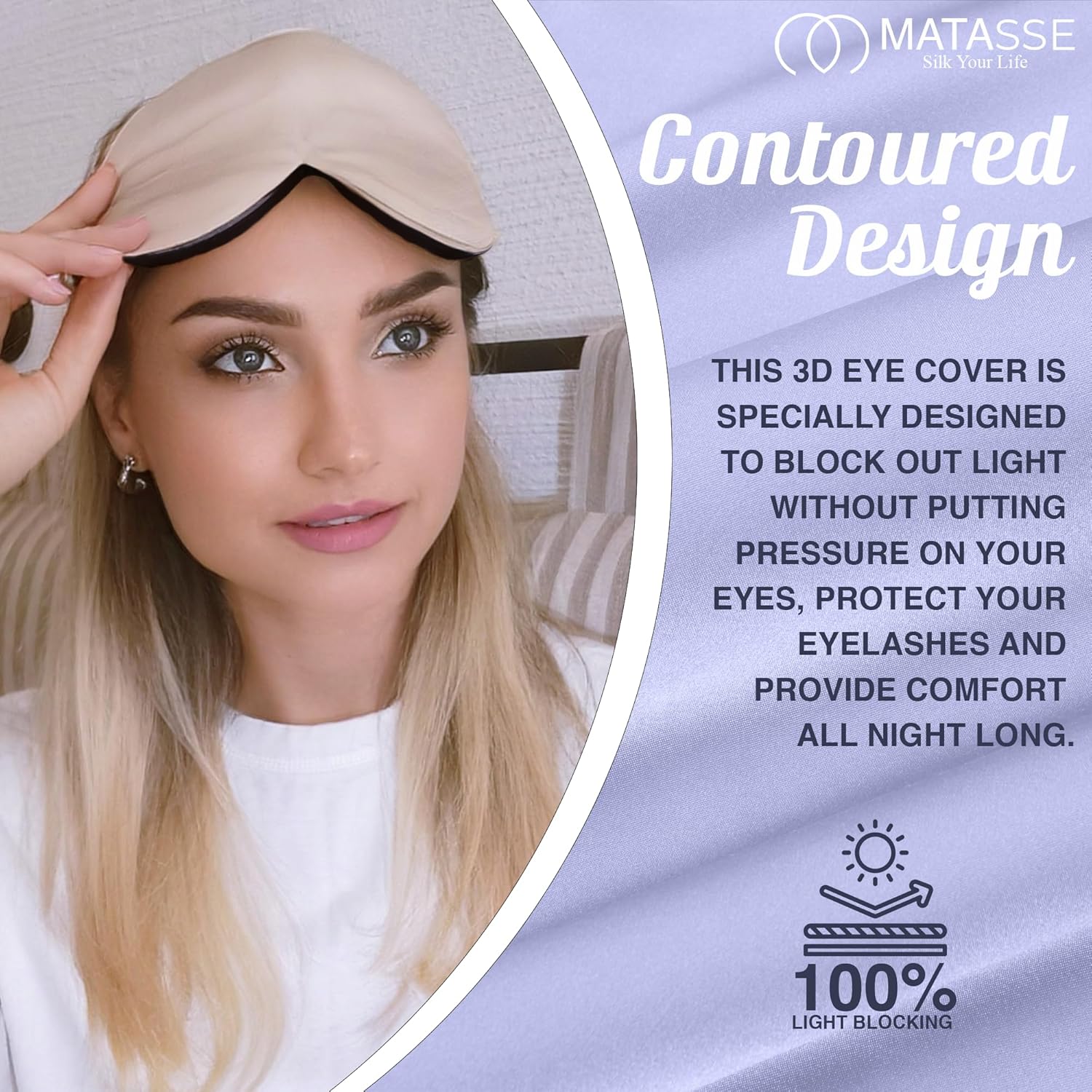 MATASSE Silk Eye Mask for Sleeping with Adjustable Elastic Band - 3D Contoured, Eye Cover Sleep Mask w/Genuine Mulberry Silk Including The Strap for Women, Men (Champagne/Black)