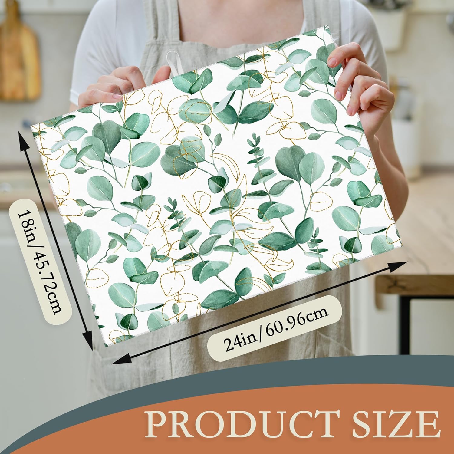 Eucalyptus Leaves Dish Drying Rack Mat for Kitchen Counter,Vintage Boho Dish Drying Pad Absorbent Reversible Microfiber Protector for Coffee Bar Sink Countertops 18x24 Inch