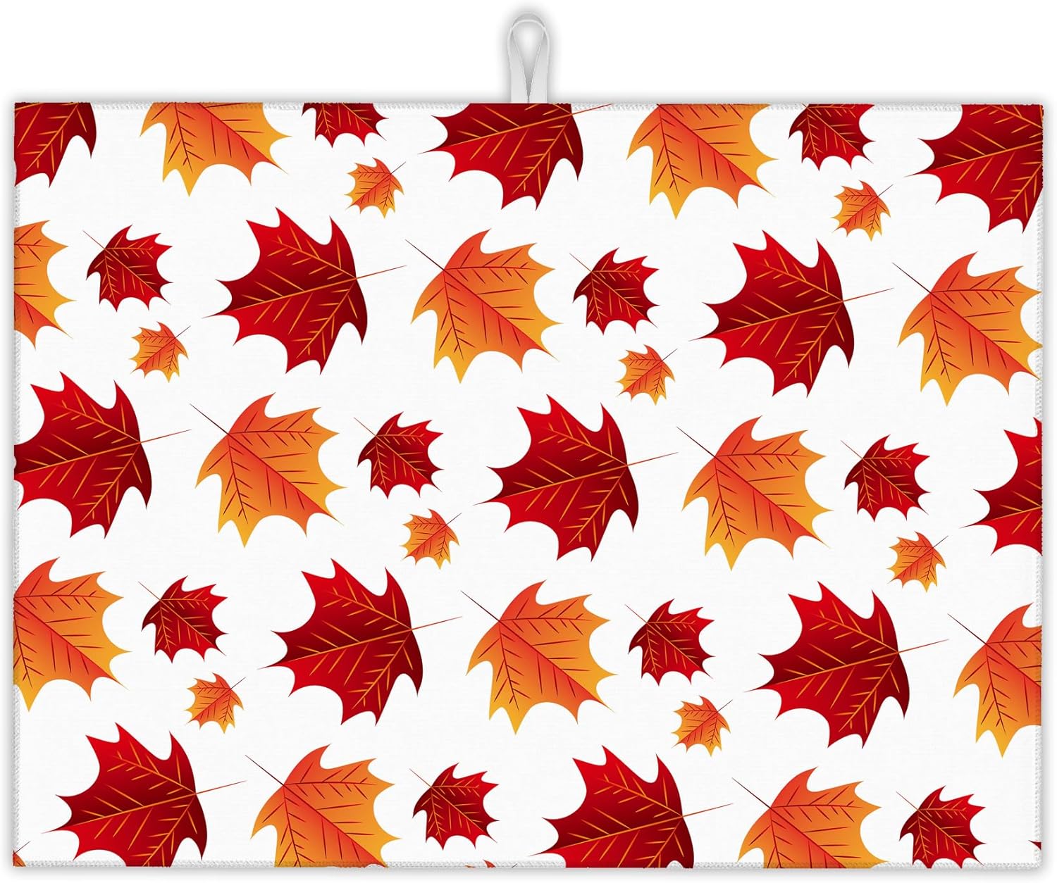 Autumn Maple Leaves Dish Drying Rack Mat for Kitchen Counter, Dish Drying Pad Absorbent Reversible Microfiber Protector for Coffee Bar Sink Countertops 18x24 Inch