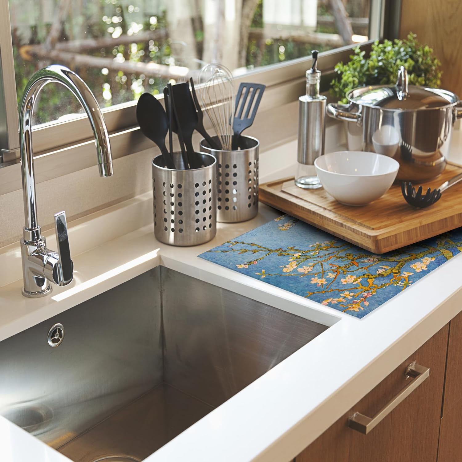 Almond Blossom Tree Dish Drying Mat for Kitchen Counter Decor,Flower Dish Drying Rack Pad Absorbent Reversible Microfiber for Coffee Tableware Sink Countertop 18x24 Inch