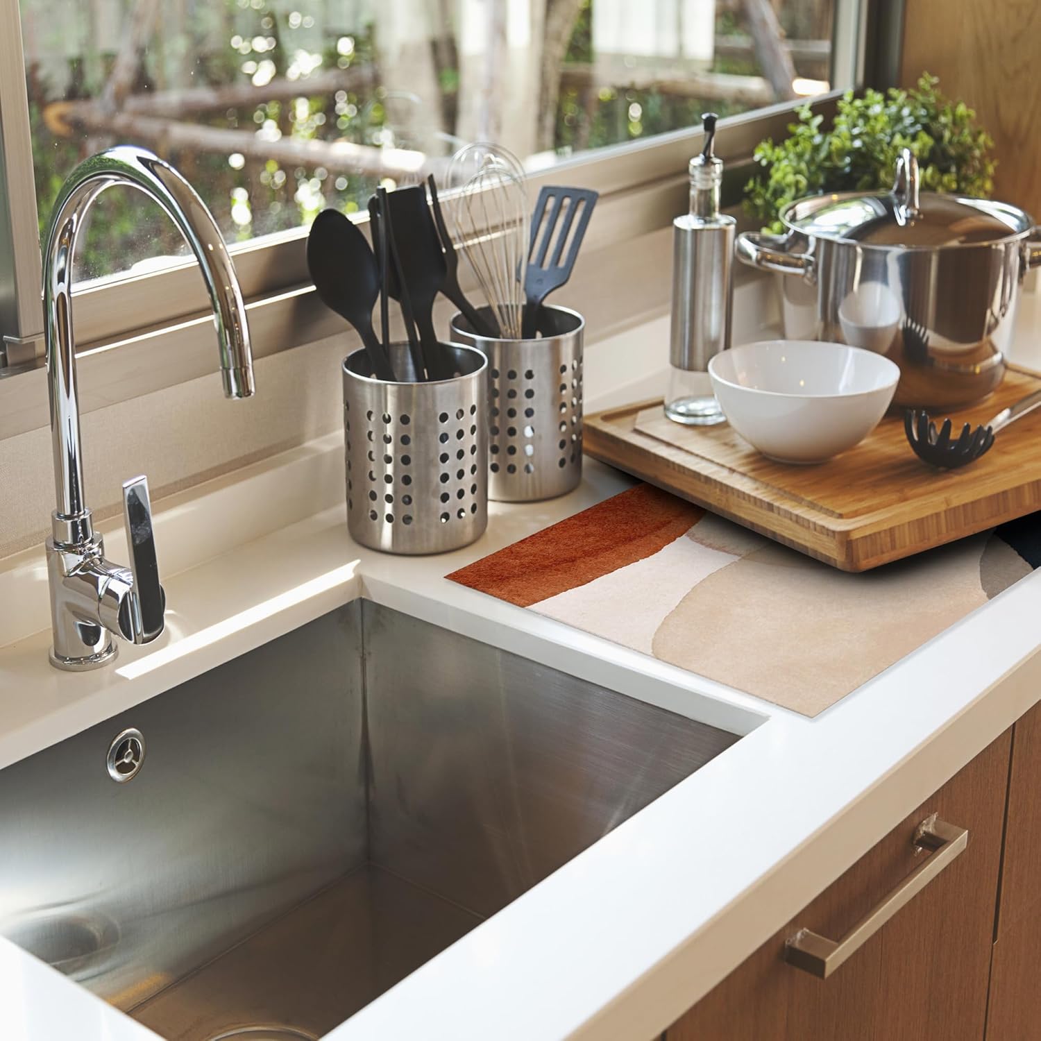 - QUICK DRY: Microfiber terry cloth on the other side absorbs 4X its weight in water, easily keep your counter dry. Our drying mat will suck up all the leftover wetness from your pots, pans, and dishes, and leave the underside both dry. Use alone or pair with a dish drying rack.Offered in rich color options these drying mats are the perfect functional addition to your kitchen decor.