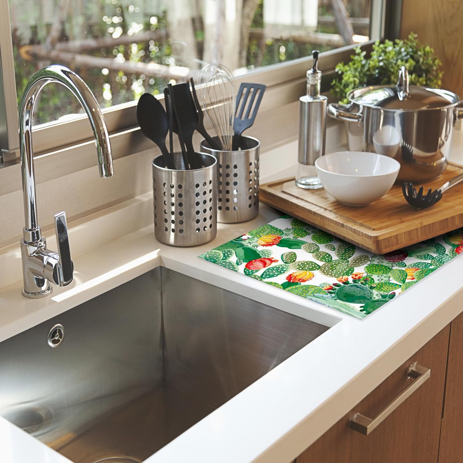 Green Cactus Dish Drying Mat, Tropical Plant Drying Rack Pad Countertop Dishes Ultra Absorbent Microfiber Kitchen Counter Mat for Coffee Countertop Decor 18x24 Inch