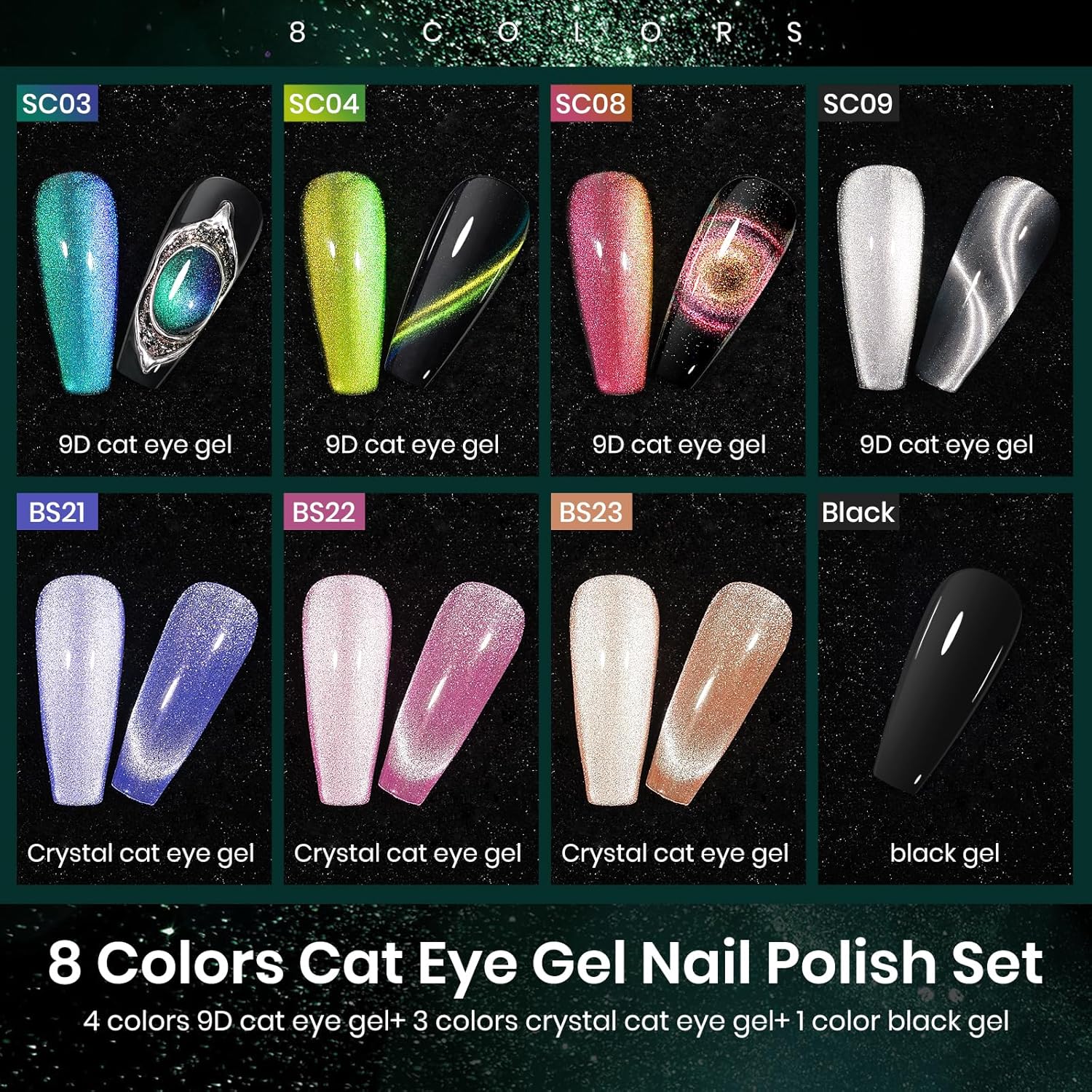 - New Upgraded Cat Eye Gel Nail Polish: 8 colors magnetic gel polish collection, which Include 9d Cat Eye Gel Polish*4, Shiny Wide Cat Eye Gel*3, Black Base Nail Gel*1, double-headed magnet stick*1. All-in-1 kit, save your money and time at the nail salon! Enjoy the DIY fun of nail beauty at home. Suitable for natural nails, false nails, acrylic nails, etc