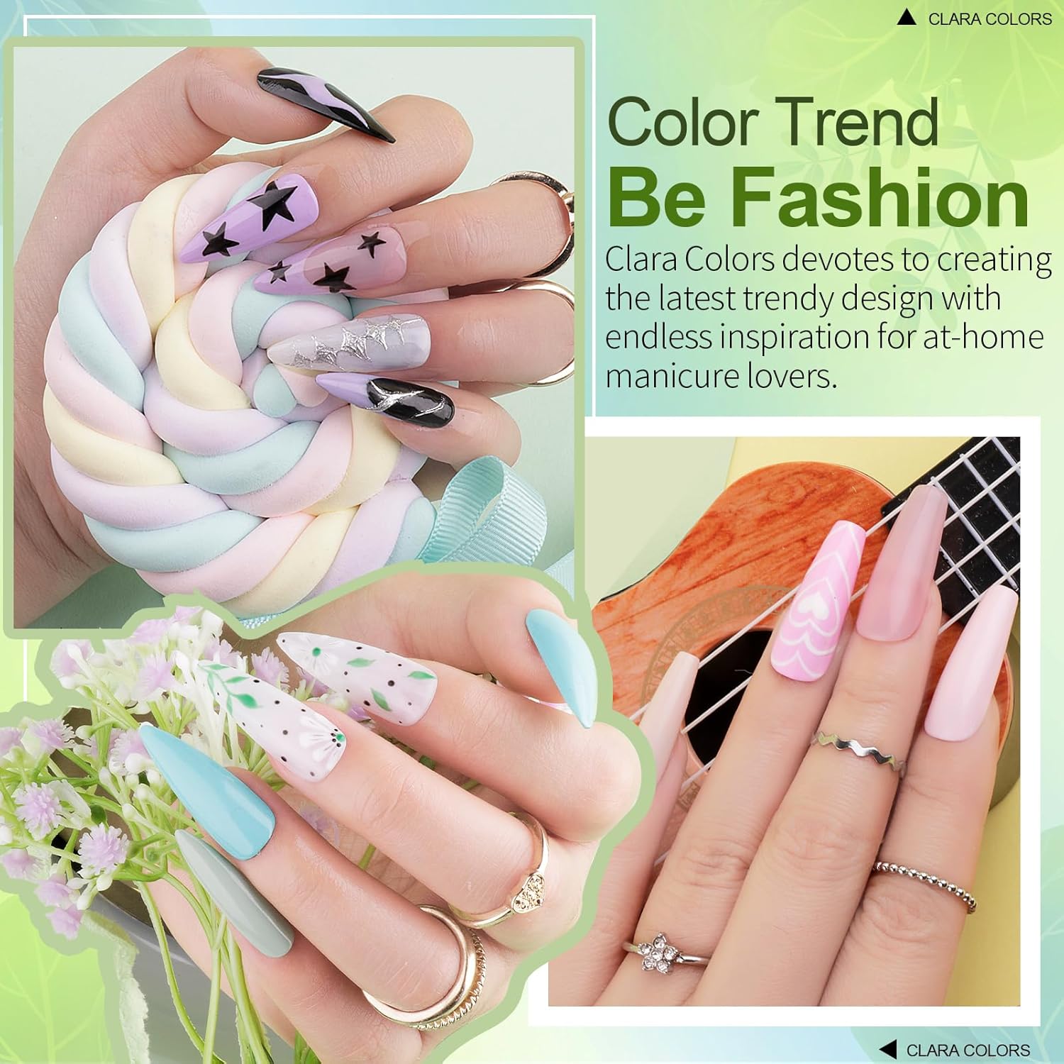 - Clara Colors Spring Nail Art Design: Clara Colors 2024 spring summer nail color with 60 different shades of popular and trendy colors, suitable for all seasons and daily routine life! To make it easier for you to design your spring and summer manicure, we have thoughtfully included butterfly and flower nail stickers in these gel nail kit. You are free to create floral nail art.