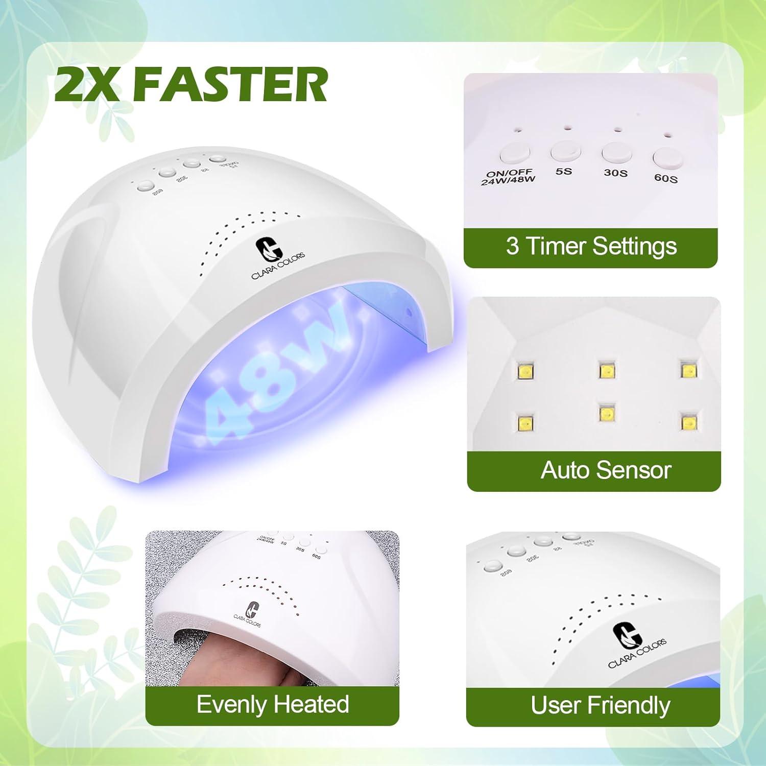 - Quick Drying UV LED Lamp: Our gel nail polish kit with 48W powerful nail lamp, it has a LCD display and 3 curing modes, 5s, 30s, 60s. And it contains 30 dual-light source lamp beads and can cure each nail in all directions, which cures quickly; Besides, the auto sensors on the lamp control the light, just put your hand in and the light will turn on automatic light, release, the light will automatically go out. Suitable for professional salons and personal families.