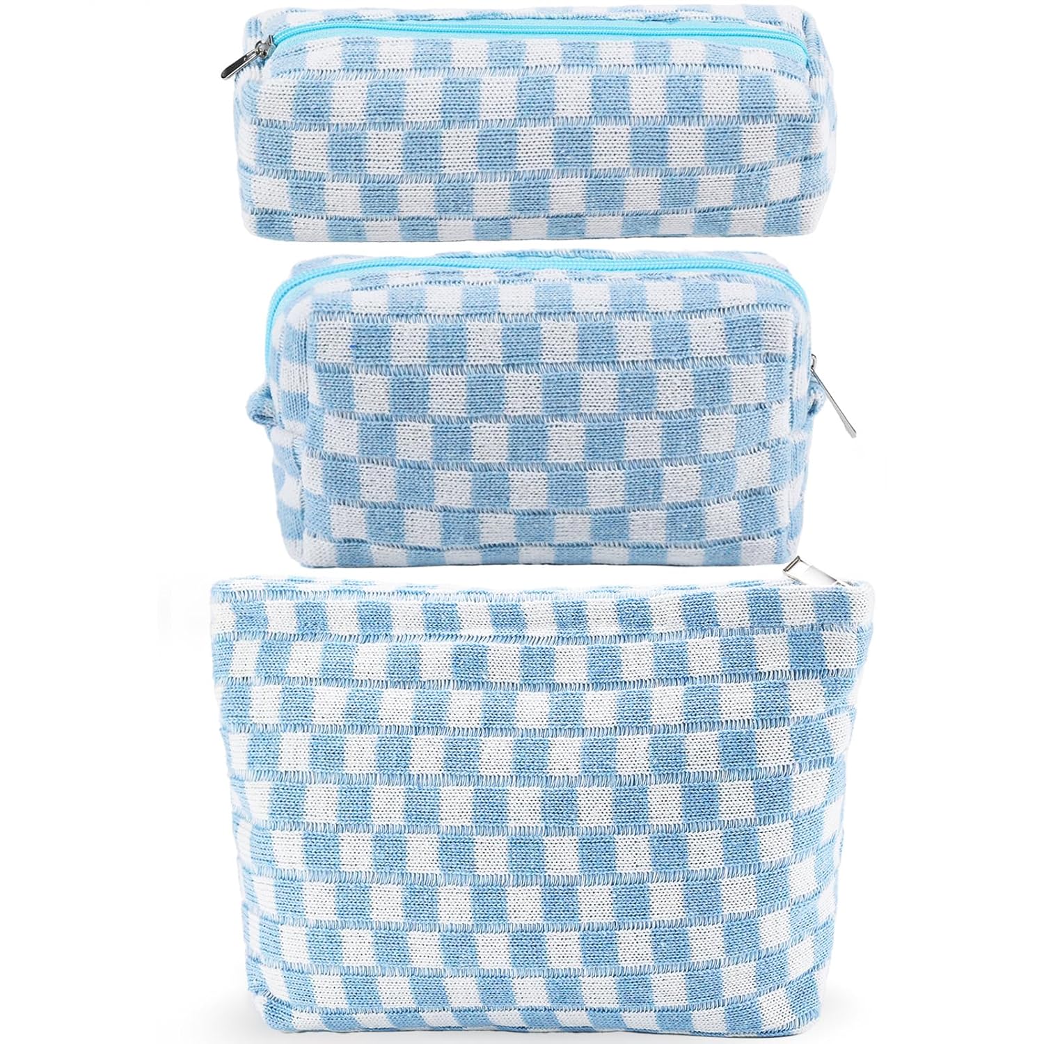 ZLFSRQ 3Pcs Checkered Makeup Bag for Women Large Small Checkered Cosmetic Bag Set Aesthetic Preppy Pencil Case Cute Pencil Pouch Blue Makeup Pouch for Purse Travel Toiletry Bags Zipper Skincare Bags