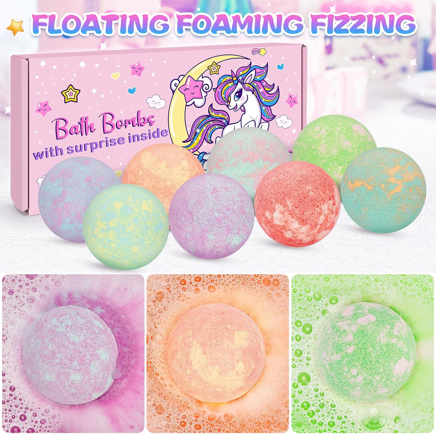Unicorn Bath Bombs for Kids Girls with Surprise Inside, 8 Pcs Natural Fizzy Princess Bubble Bath Bomb Kit with Toys, Birthday Gift for 3 4 5 6 Year Old Girl