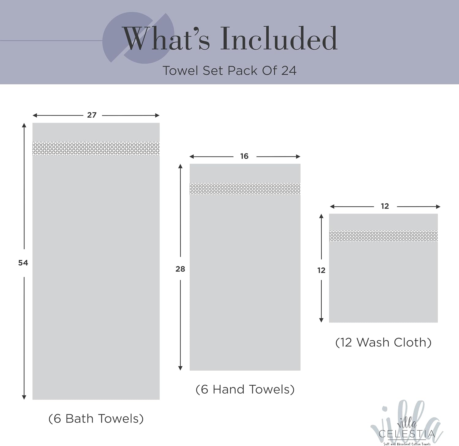 - VILLA CELESTIA LUXURIOUS TOWEL SET (PACK OF 24): Uplift your mood and bathing experience with the super soft and luxurious touch of our Villa Celestia Bath Towels Set. Bundled in a 24 pack design, our towel sets for bathroom consists of 6 Bath Towels (27β X 54β), 6 Hand Towels (16β X 28β), and 12 Washcloths (12β X 12β), giving you the complete package of comfort, indulgence, and delight.