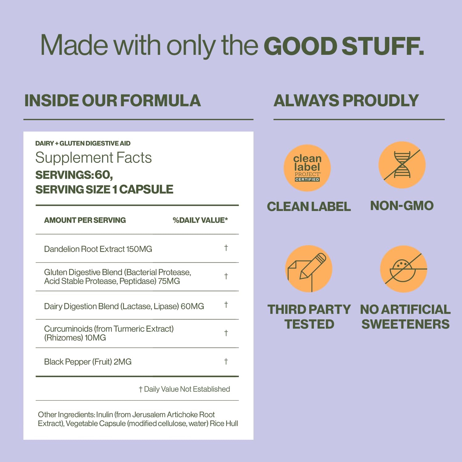 - Fast relief: Take our bloating relief before meals to enjoy gluten and dairy without the bloat or upset stomach: our lactase enzyme tablets help the body digest dairy, plus other digestive enzymes and herbs aid digestion of gluten and protein