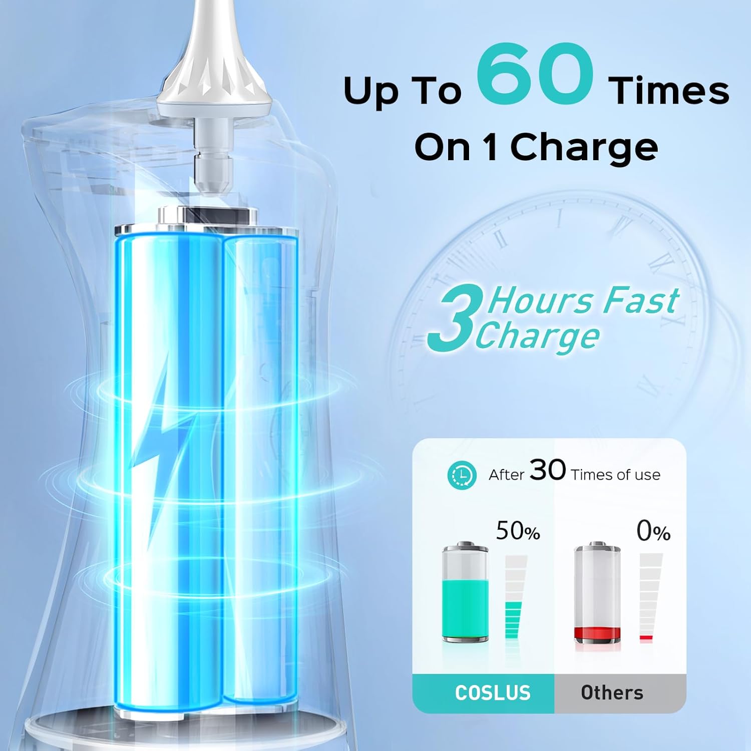 - Gentle Oral Care with Precision Clean: After 5 years of R&D by the COSLUS team, we present a certified, superior water flosser pick, the wireless flosser can offer 1400-1800 dual-pulse streams/min and 30-150PSI adjustable strong water pressure for dental plaque removal. Gum sensitive flosser with 4 multi-functional nozzles, easily removes food debris trapped between braces, meanwhile meets the comprehensive oral care of teeth, gums and tongue can effectively solve and supports oral health by targeting common concerns