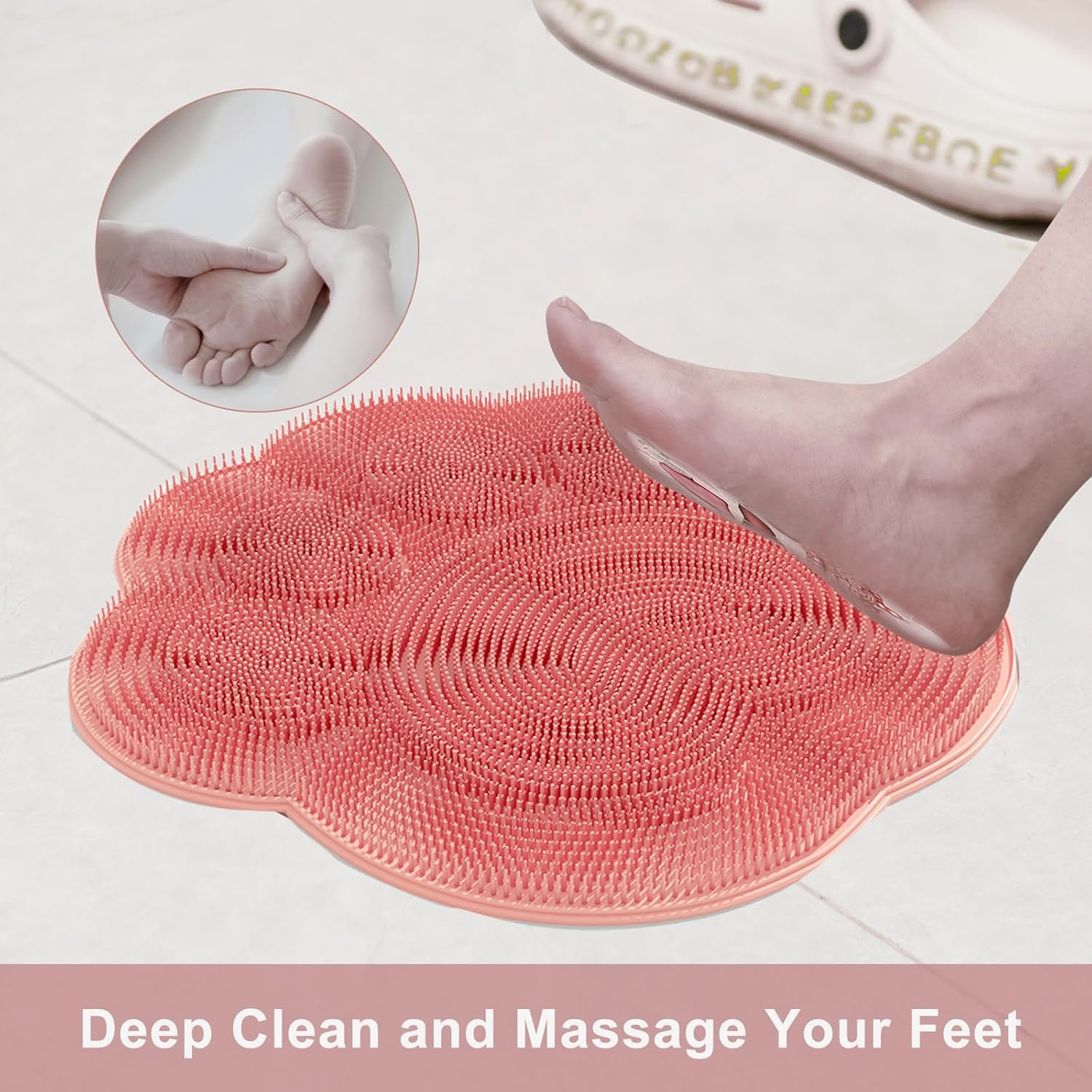 - Suction Cups Foot Scrubber in Shower:Our silicone shower foot scrubber mat features a unique suction cup design at the bottom, and the Shower Foot and Back Scrubber with suction cups firmly sucks onto the floor or the wall,Foot Scrubber in Shower can also reach walls and any other location without worrying about slipping or sliding.