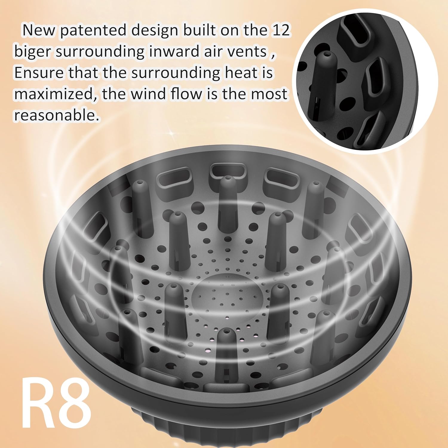 - New patented design built on the 12 biger surrounding inward air vents are designed,Ensure that the surrounding heat is maximized, the wind flow is the most reasonable, and the faster drying.even when thick, long and frizzy hair as well.