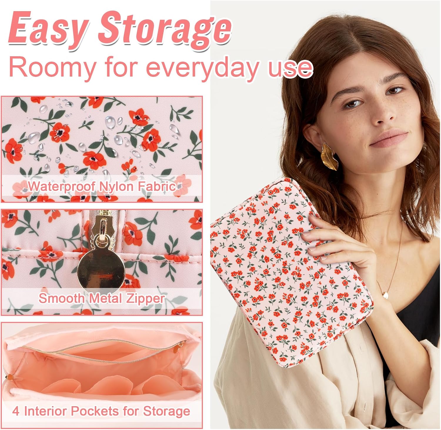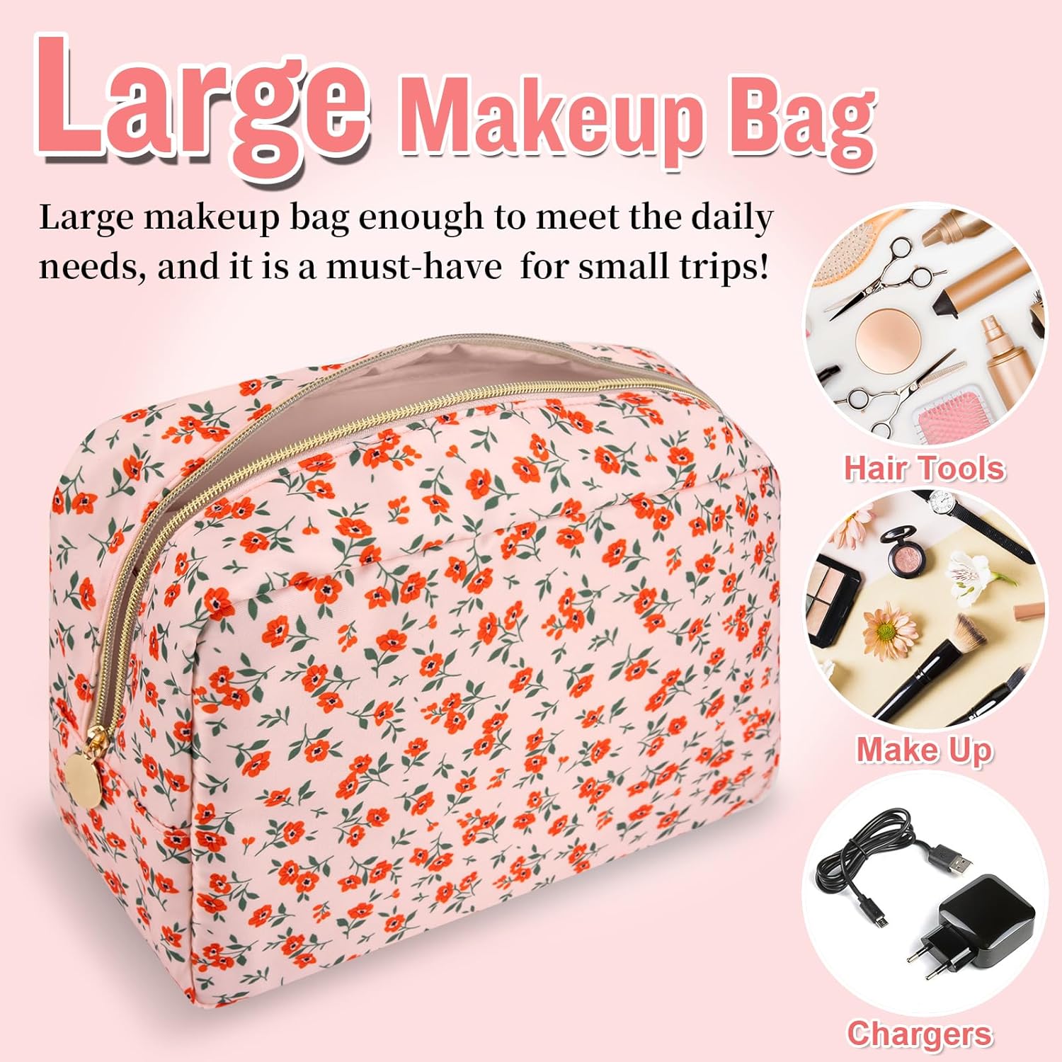 - ❤【Premium Materials】Large floral makeup bag is made of high-quality nylon waterproof material and durable gold zipper, which does not fade, has no peculiar smell, and is durable. Stylish appearance, easy to wipe clean, dustproof and waterproof. The makeup pouch interior is covered with thick sponge to protect your belongings at all times.