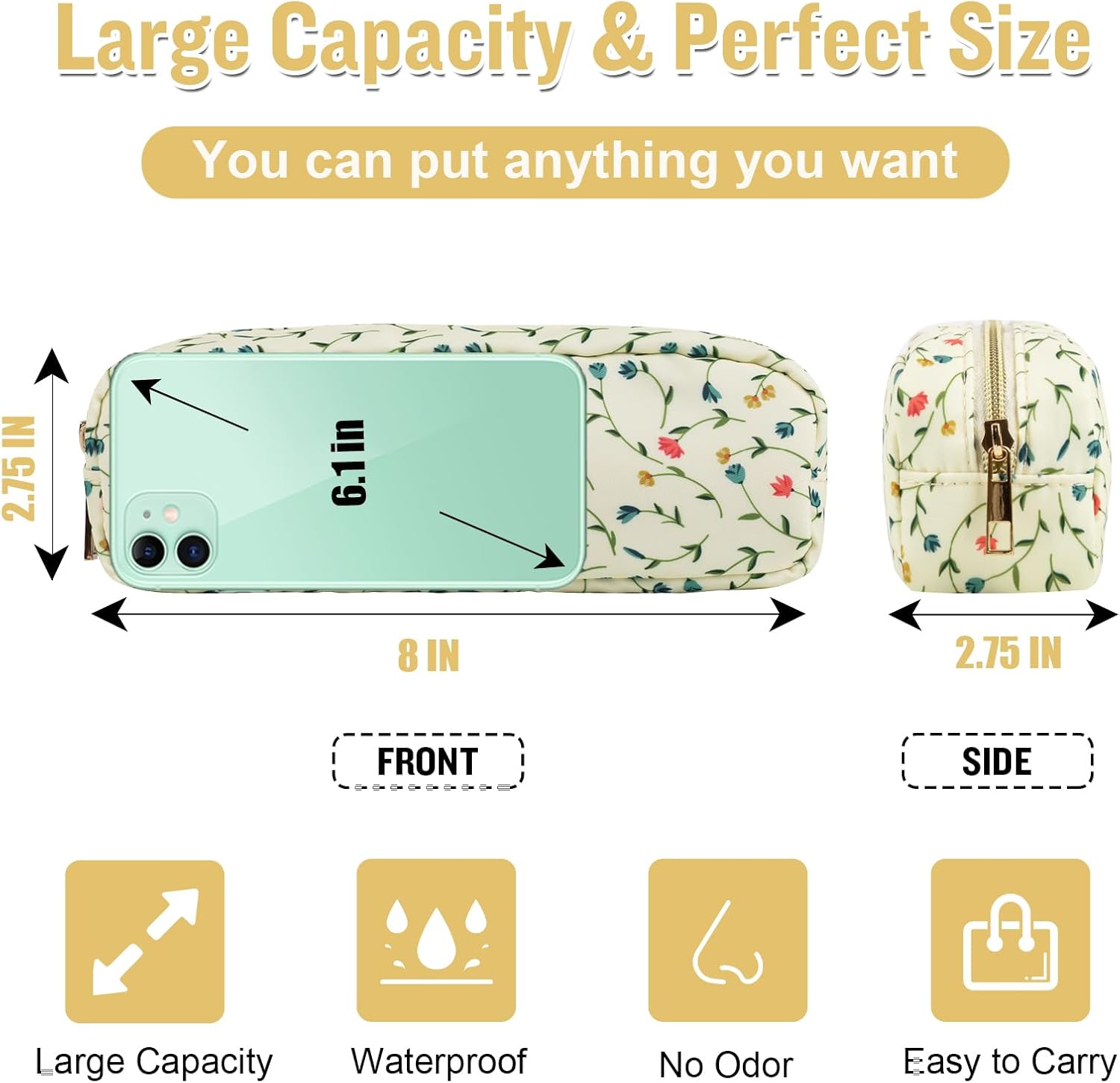 - ❤【Multiple Sizes & Colors】Large, Small, Mini, or Slim, we have it all! Cosmetic bags are available in many colors: Blue-Daisy, Green-Daisy, White-Flower, Pink-Flower and other colors for you to choose. Nylon makeup bag for purse can be used for travel, outdoors and organization, it can be used as a purse bag, travel pouch, clutch, makeup organizer and more.
