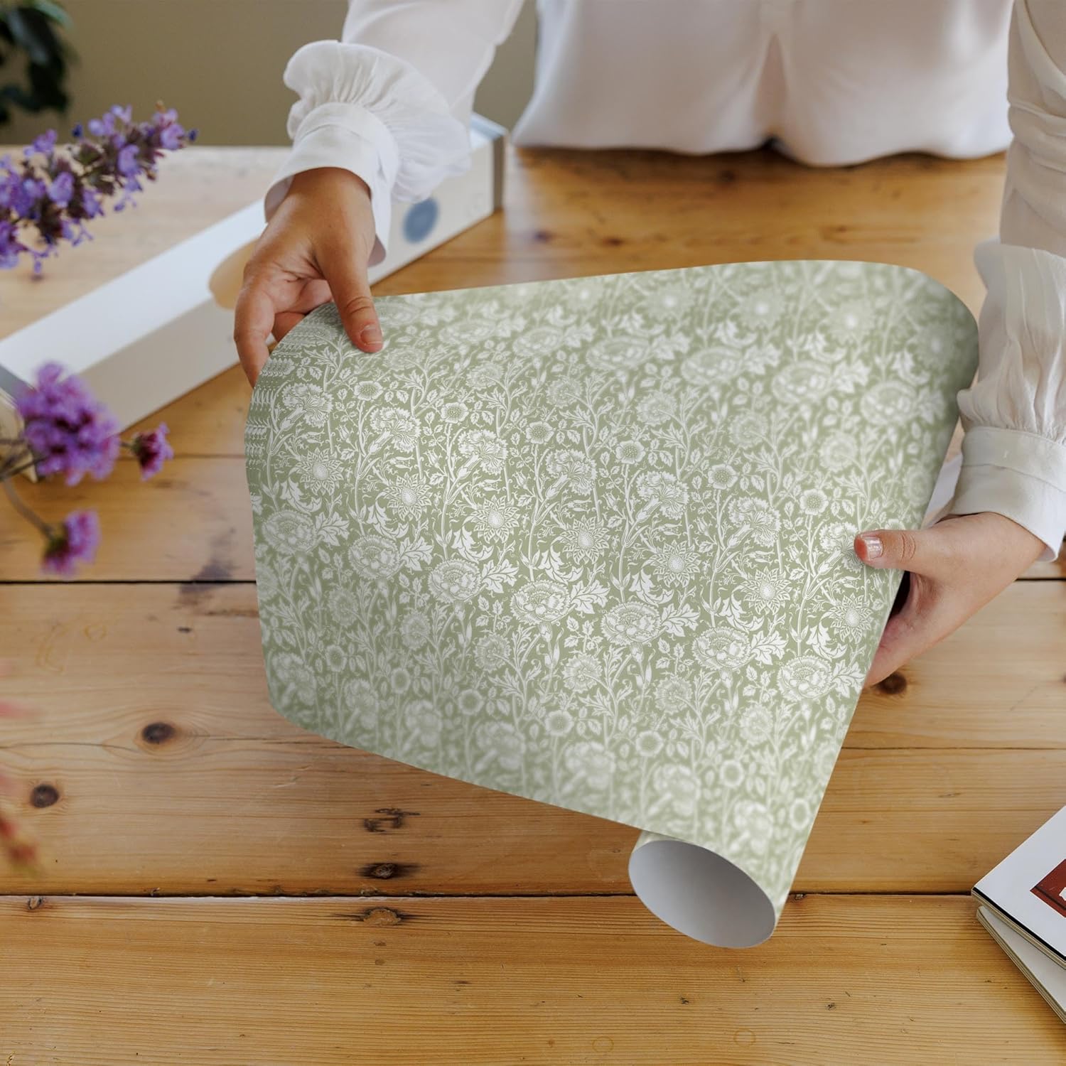 - Gift Box of 5 Sheets of Fragrant FRESH LINEN Scented Drawer Liners with Essential Oils in a SAGE GREEN William Morris Design (FOLDED). Available in: SANDALWOOD (Black), LAVENDER (Blue), ROSE (Pink), FRESH LINEN (Sage Green), LILY (Soft Grey), SPRING LILAC (Purple)