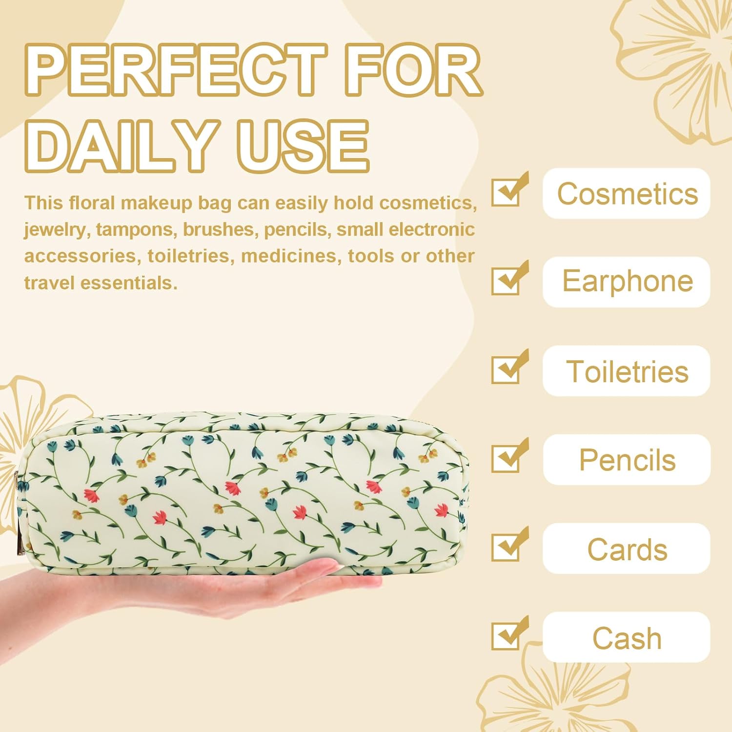 Waterproof Small Floral Pencil Case Makeup Bag for Purse,Cute Flower Pencil Pouch Preppy Nylon Makeup Brush Holder with Zipper,Girls Portable Storage Case Pen Bag for Work(Slim Light Yellow-Flowers)