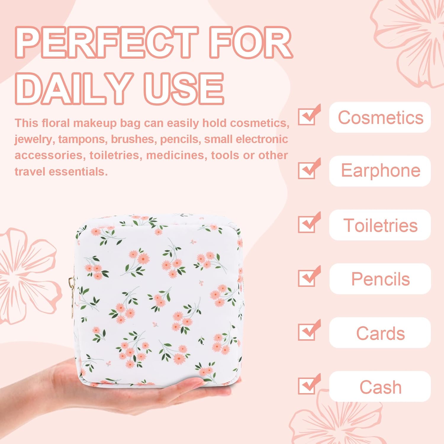 Waterproof Mini Floral Makeup Bag Pouch for Purse,Nylon Flower Cosmetic Travel Bag Small Preppy Toiletry Organizers Bag for Women Girl,Cute Zipper Pouch Coin Purse for Work(Mini White-Flowers)