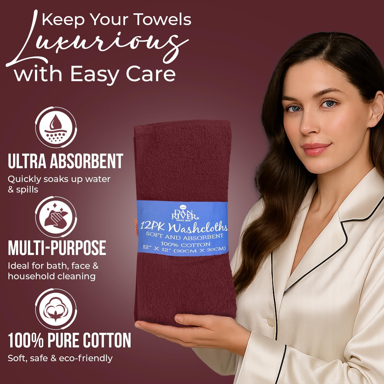 DAN RIVER 100% Cotton Wash Cloths 12 Pack [12x12] Soft & Absorbent Rags for Body, Gym, Hotels & Spa Perfect for Everyday Use Fingertip Towels, Pomegranate