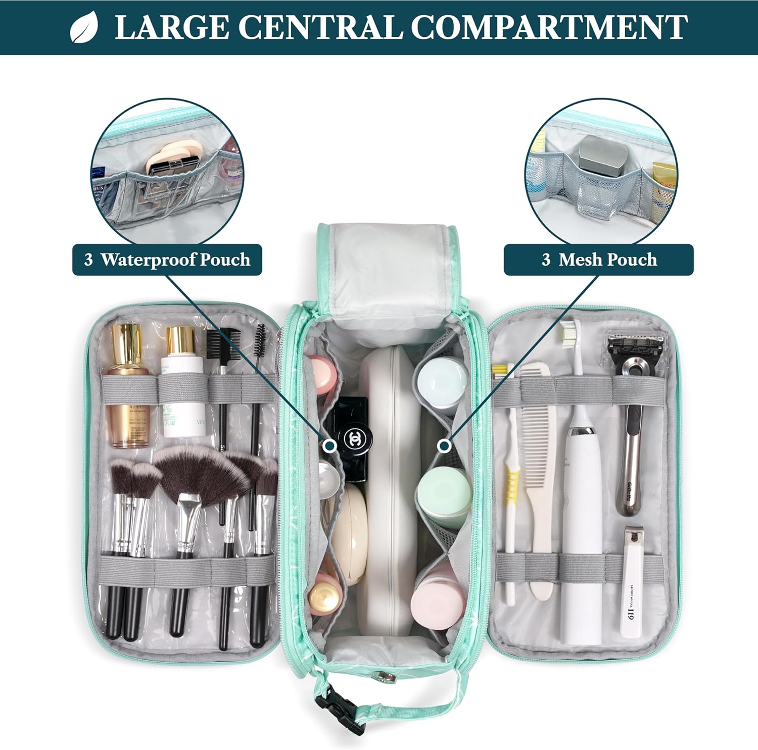 - MENS TOILETRY BAG: This functional PU leather toiletry travel bag has a large compartment and side pockets with additional pockets to hold all your toiletry, shaving, and grooming accessories. Equipped with elastic bands and additional mesh pockets to keep your hygiene items secured while traveling, weekend trip at hotel, or at home, this cosmetic make up case will help you stay organized.