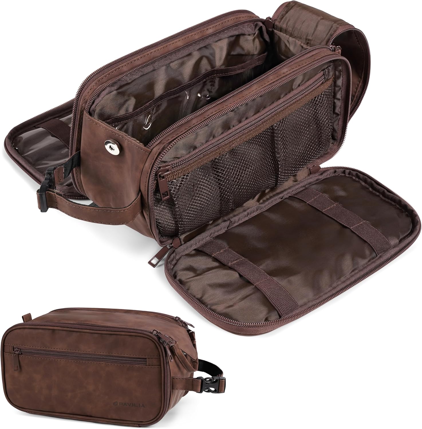 PAVILIA Toiletry Bag for Men Women, Mens Travel Bag Toiletries Organizer Case for Grooming, Travel Essentials Shaving Dopp Kit, PU Leather Water Resistant Cosmetic Pouch, Dark Brown