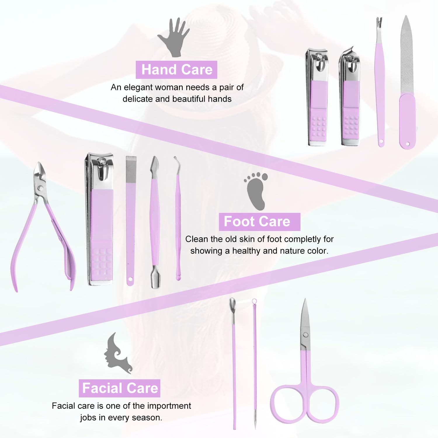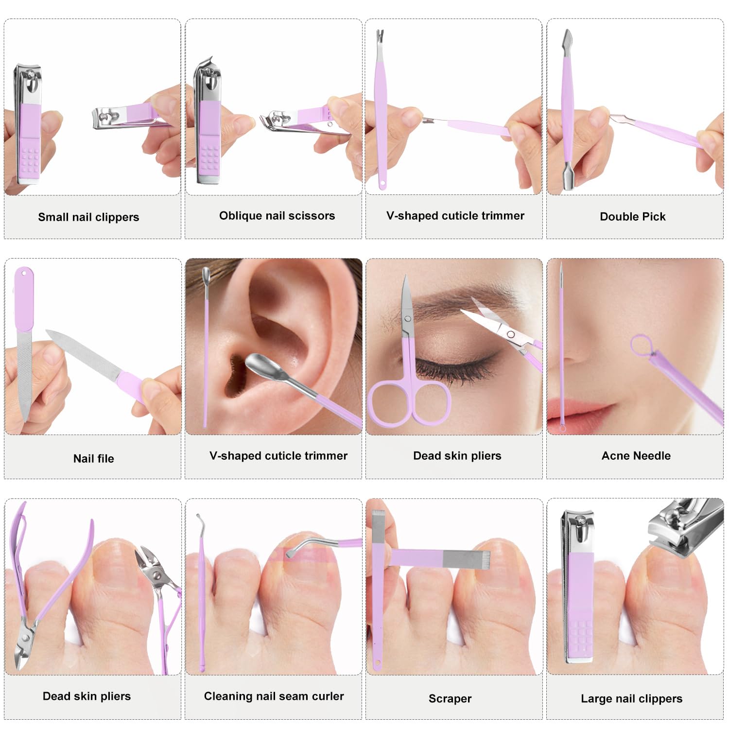 - Manicure Set:manicure and beauty kit contains 12 kinds of care tools for hands and feet,multifunctiona include hand care,facial care,foot care tools,can meet all of you needs, Nail Kit, Manicure Kit, Nail Care Kit For Women.