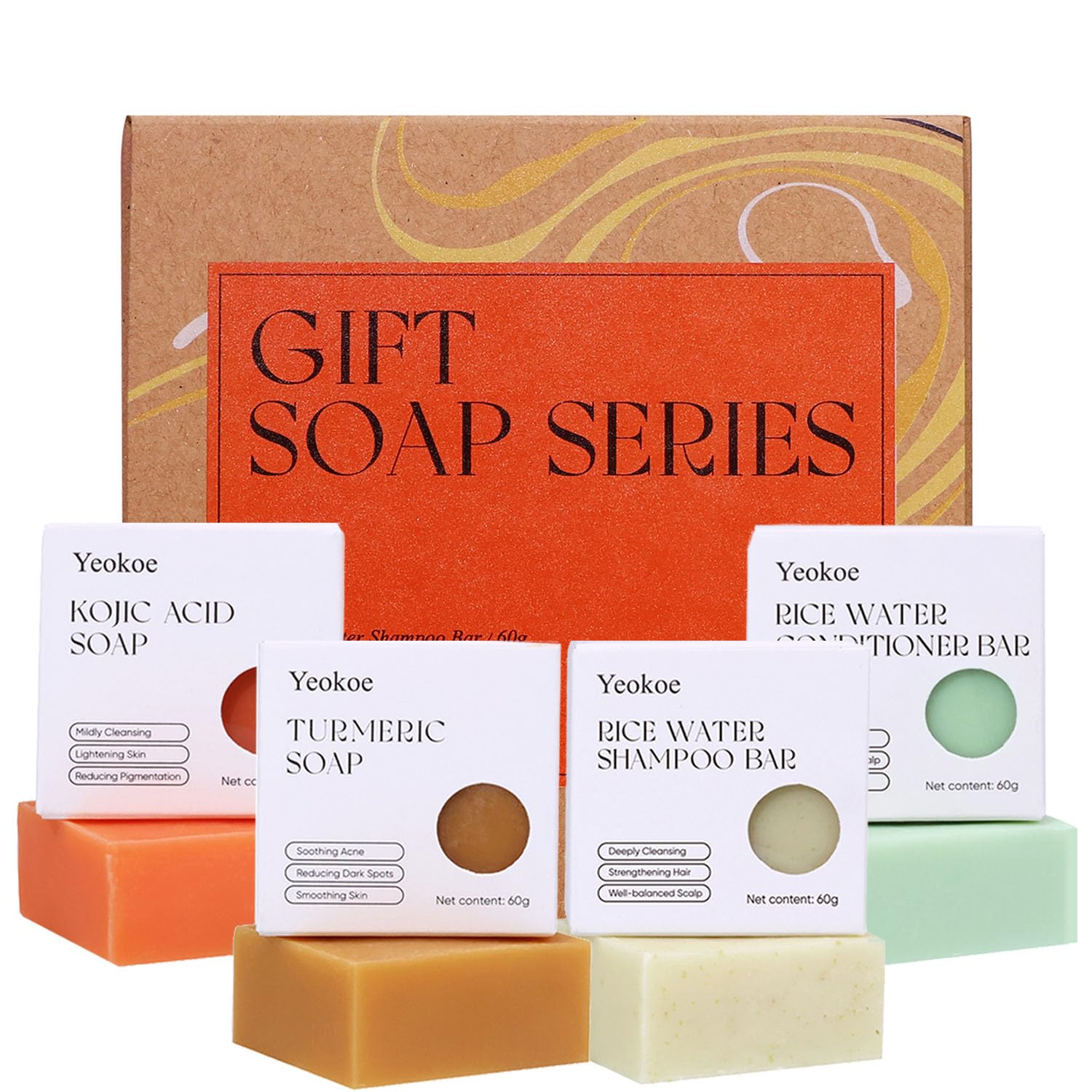 - YEOKOE gift soap includes 4 basic care soaps(2in*2in), including rice water shampoo bar 60g, rice water conditioner soap 60g, turmeric soap bar 60g, and kojic acid soap 60g. It also comes with a foaming net to meet all your care needs in one go. Independent packaging, very suitable for carrying on business trips and travels