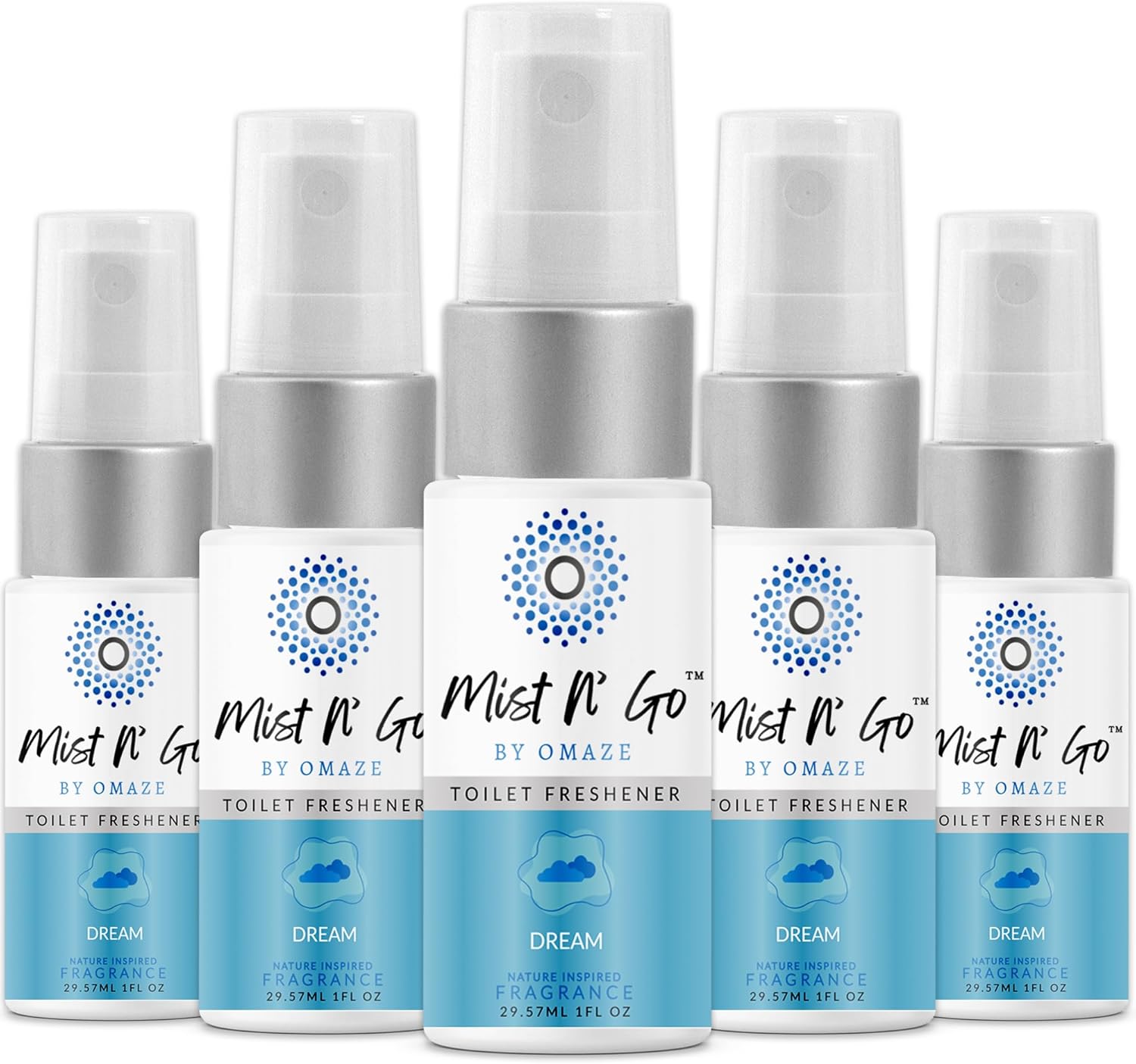 Mist N’ Go by Omaze Travel Bathroom Spray for Toilet Spray Odor Eliminator - Travel Toilet Spray for Bathroom Air Freshener Spray for Bathroom Deodorizer - Dream Travel Size (1oz x5)