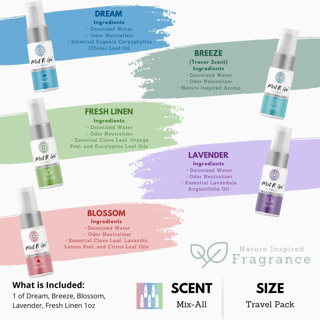 Mist N’ Go by Omaze Travel Bathroom Spray for Toilet Spray Odor Eliminator - Travel Toilet Spray for Bathroom Air Freshener Spray for Bathroom Deodorizer - Mix All, Travel Size (1oz x5)