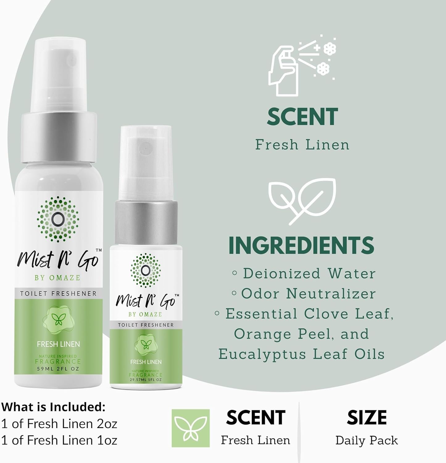 Mist N' Go Omaze Travel Toilet Spray Odor Eliminator - Fresh Linen Daily Pack (2oz + 1oz)
