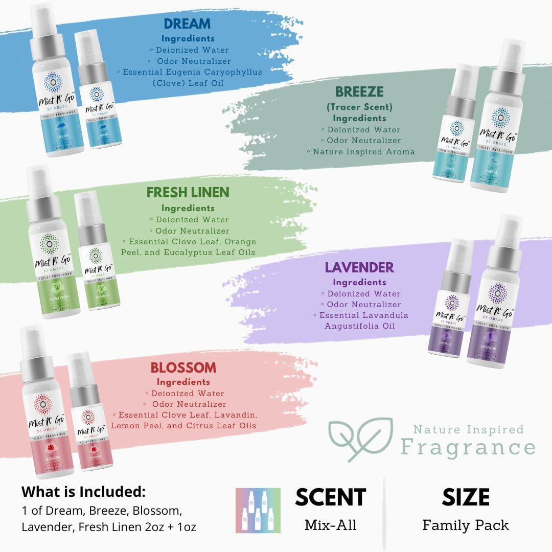 Mist N’ Go by Omaze Travel Bathroom Spray for Toilet Spray Odor Eliminator - Travel Toilet Spray for Bathroom Air Freshener Spray for Bathroom Deodorizer - Mix All, Family Pack (2oz x5 + 1oz x5)