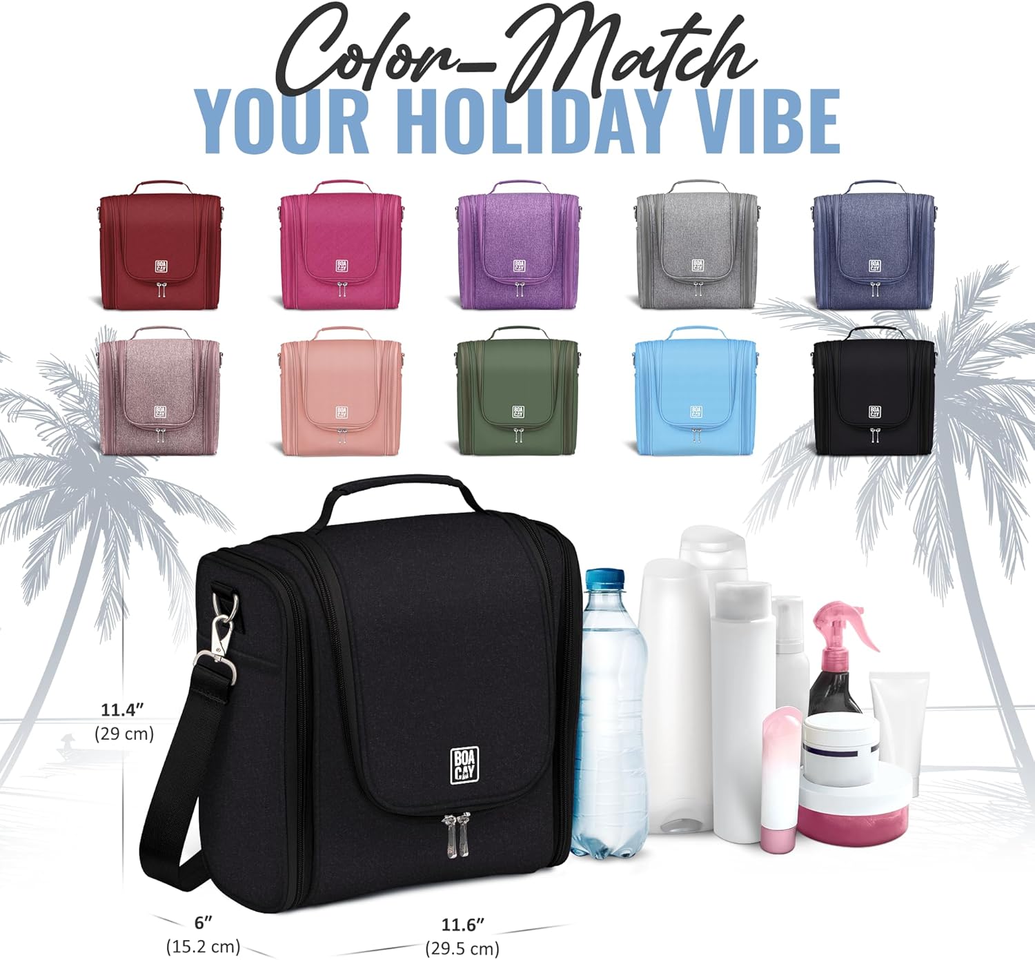 - If you want a large makeup bag, a cosmetic, or an accessories organizer, Boacay toiletry bag is for you. It is multifunctional, has metal zipper pulls, and it’s made of only high-quality materials.