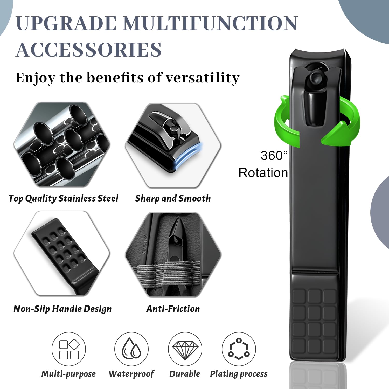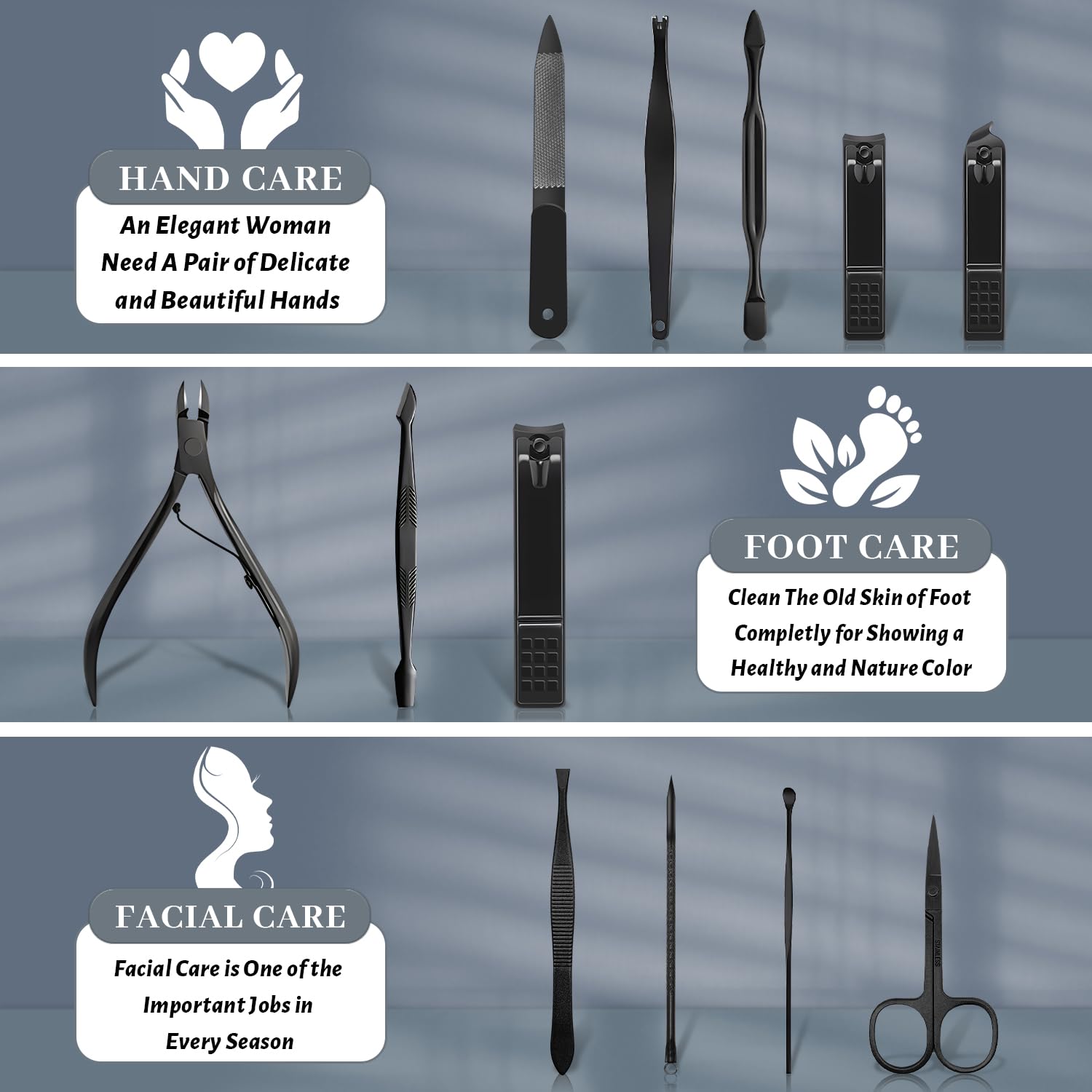 - Professional Nail Care Kit: Made of high-quality stainless steel, nail clippers are sharp and durable. Large, small, diagonal clippers can cut every corner of nails and trim thick/hard nails easily. The nail grooming kit is coated with an anti-rust black coating, which is pretty and practical, and also not easy to rust.