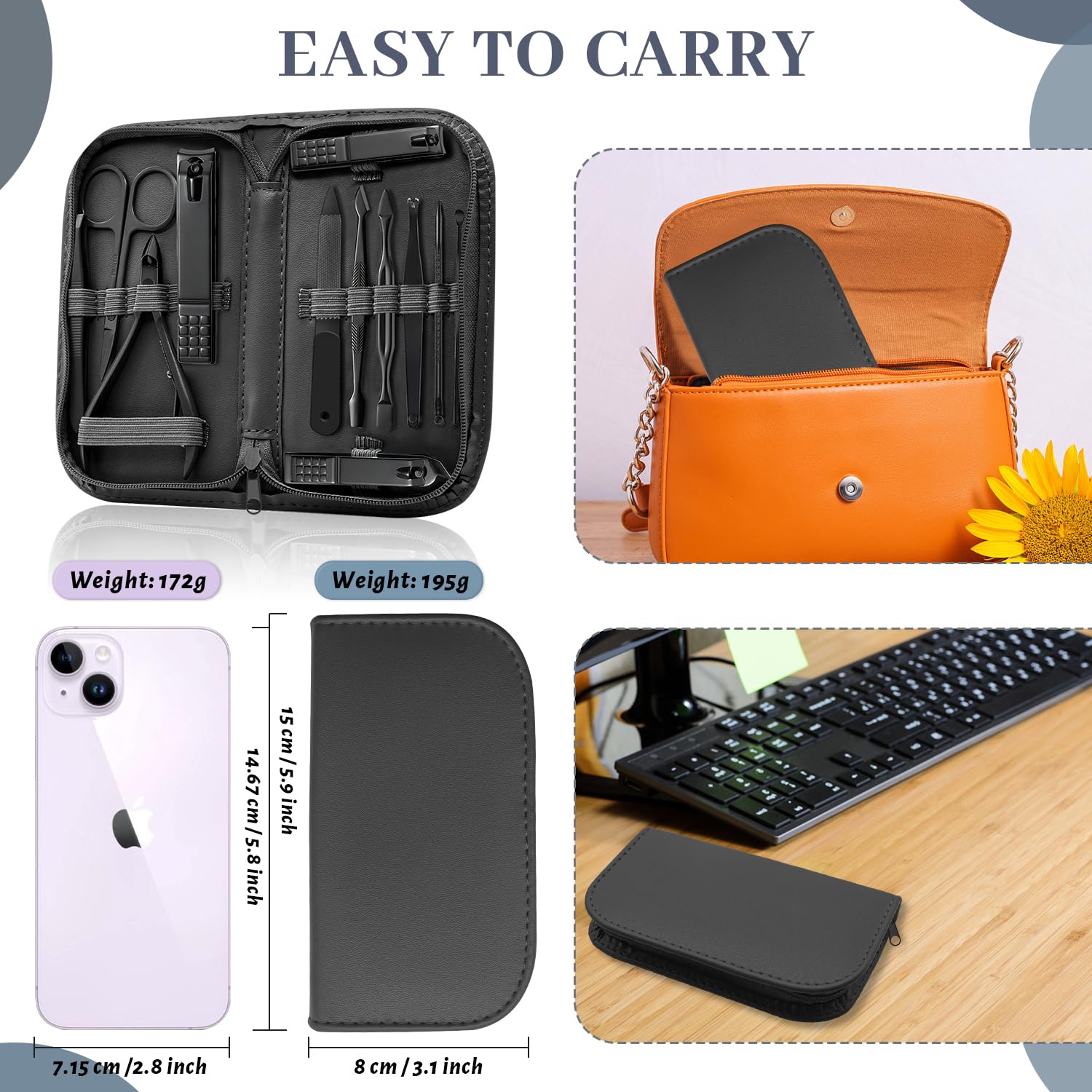 - Travel Nail Kit: Various manicure/pedicure tools are needed in a stylish zippered case. It has the right size 8*15*2.3cm and weighs 200g. So handy to take in luggage or a bag, compact great for traveling or the upcoming trip, offering your convenient daily personal mani/pedi care.