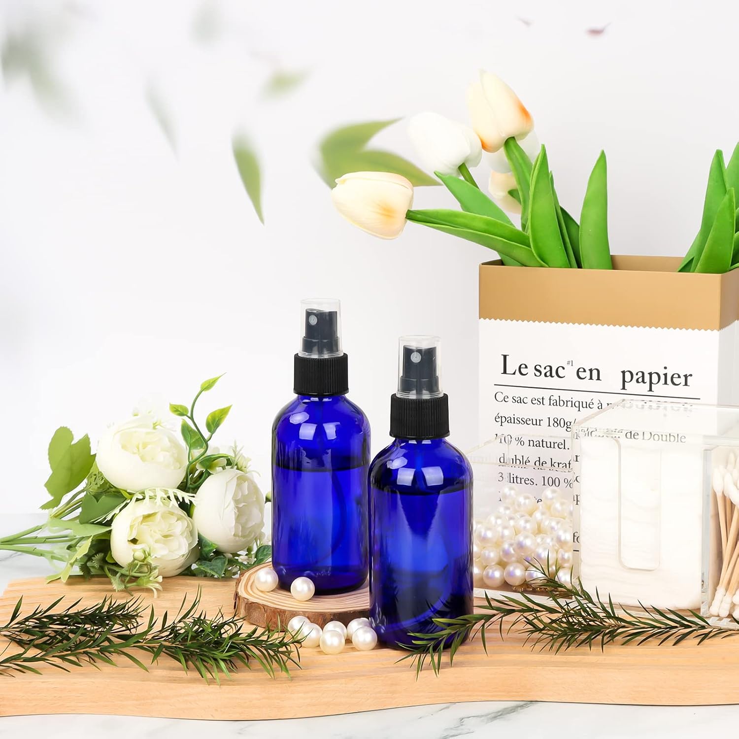 CycleMore 25 Pack 4oz Blue Glass Spray Bottles with Fine Mist Sprayers, Glass Travel Bottles for Cosmetic Essential Oils Cleaning Solutions Perfumes & More Liquids (1 Brush, 2 Funnels and 36 Labels)