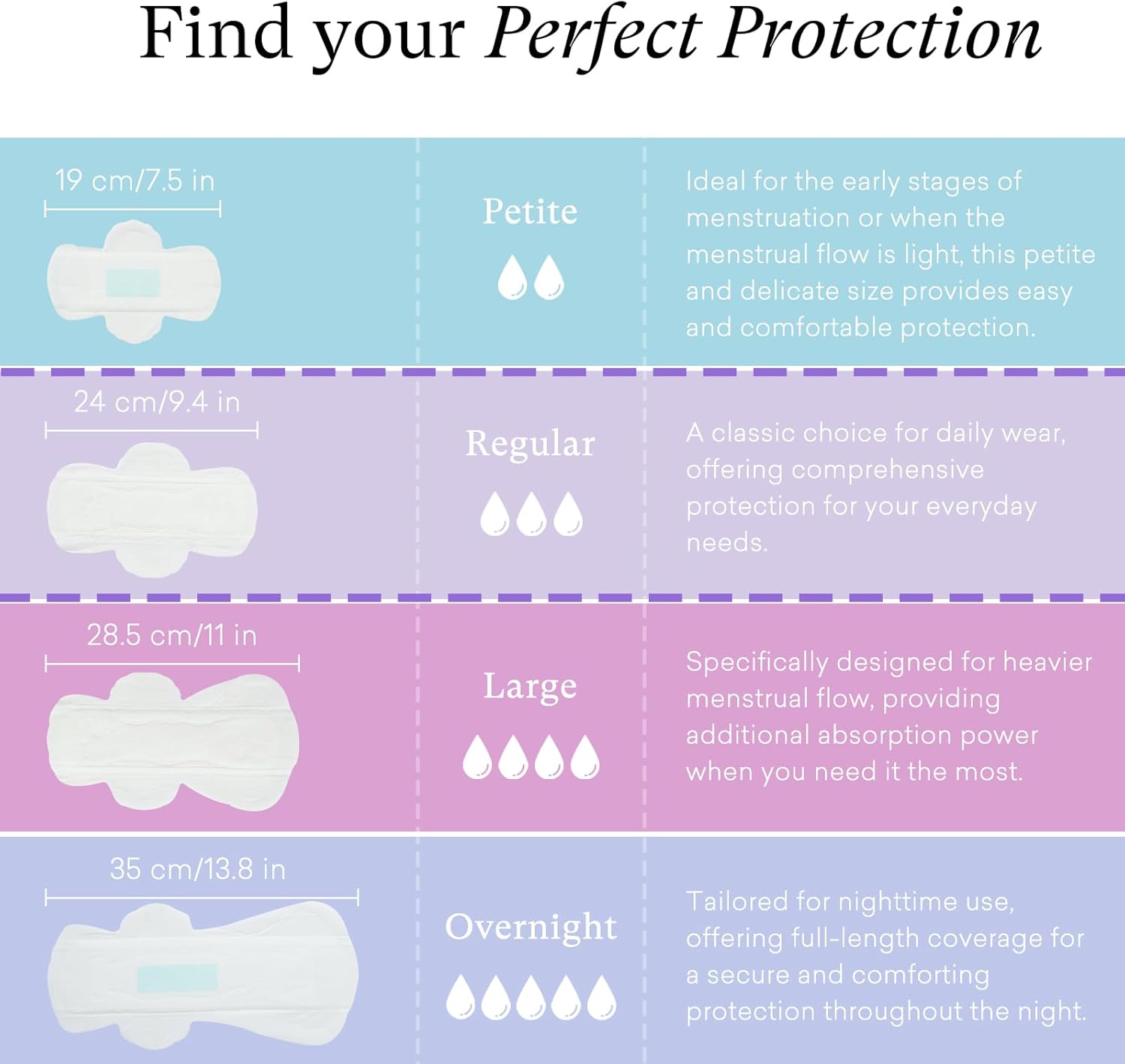 - Size Variety Galore: Purcomfy presents a diverse range of options! Alongside the 9.45-inch regular Size, we also offer the 7.5-inch petite mini size, the 11.22-inch super absorbent large size pads, and the grand 13.78-inch overnight size pads—essential tween pads and school must-haves for teen girls—catering to different needs. Whether it's day or night, whether you're active, studying, going out, or sleeping like a queen, our sanitary pads provide you with the best support.